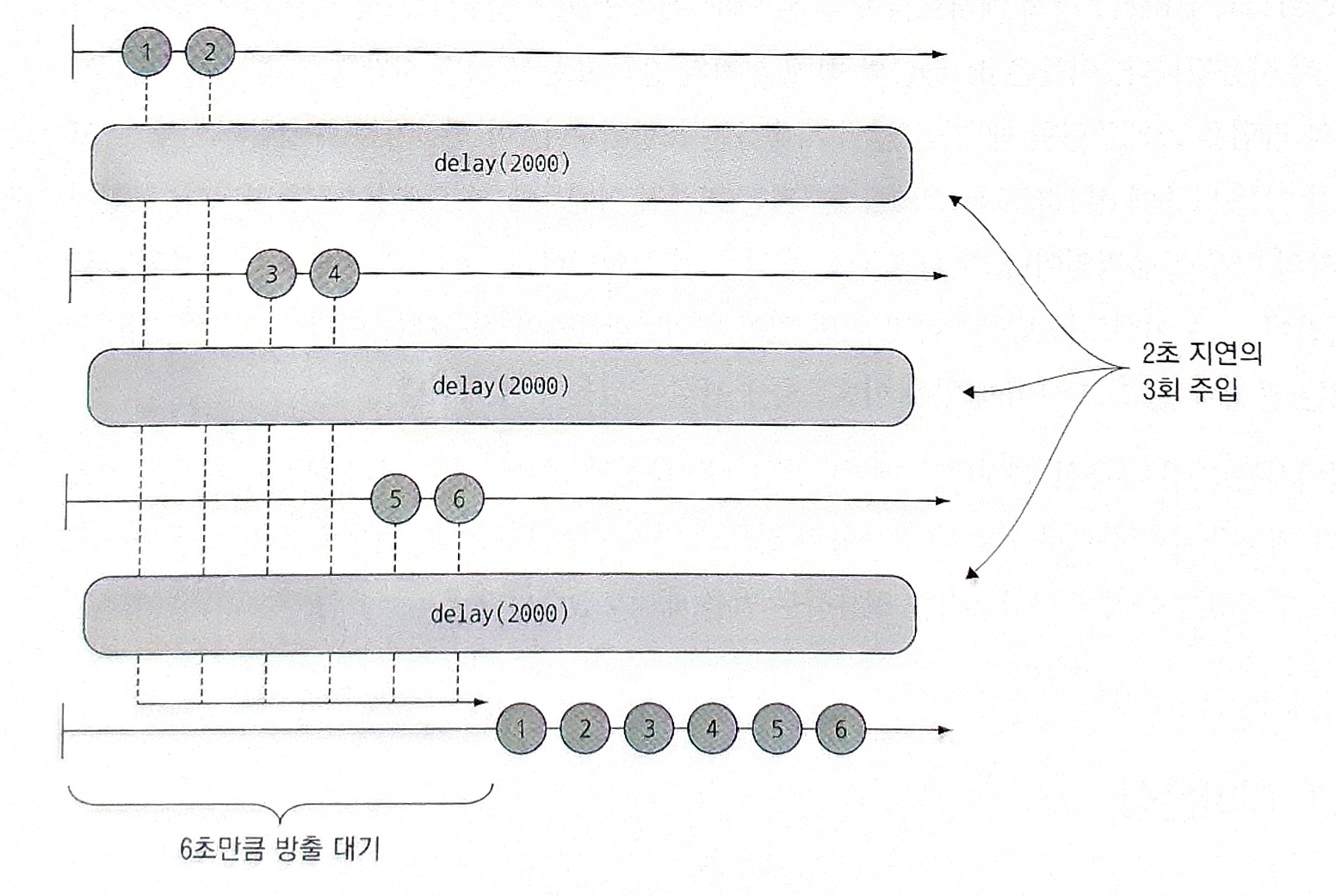 하지만 실제로 결과를 보면 6초 경과 후 [1, 2, 3, 4, 5, 6]을 출력한다.