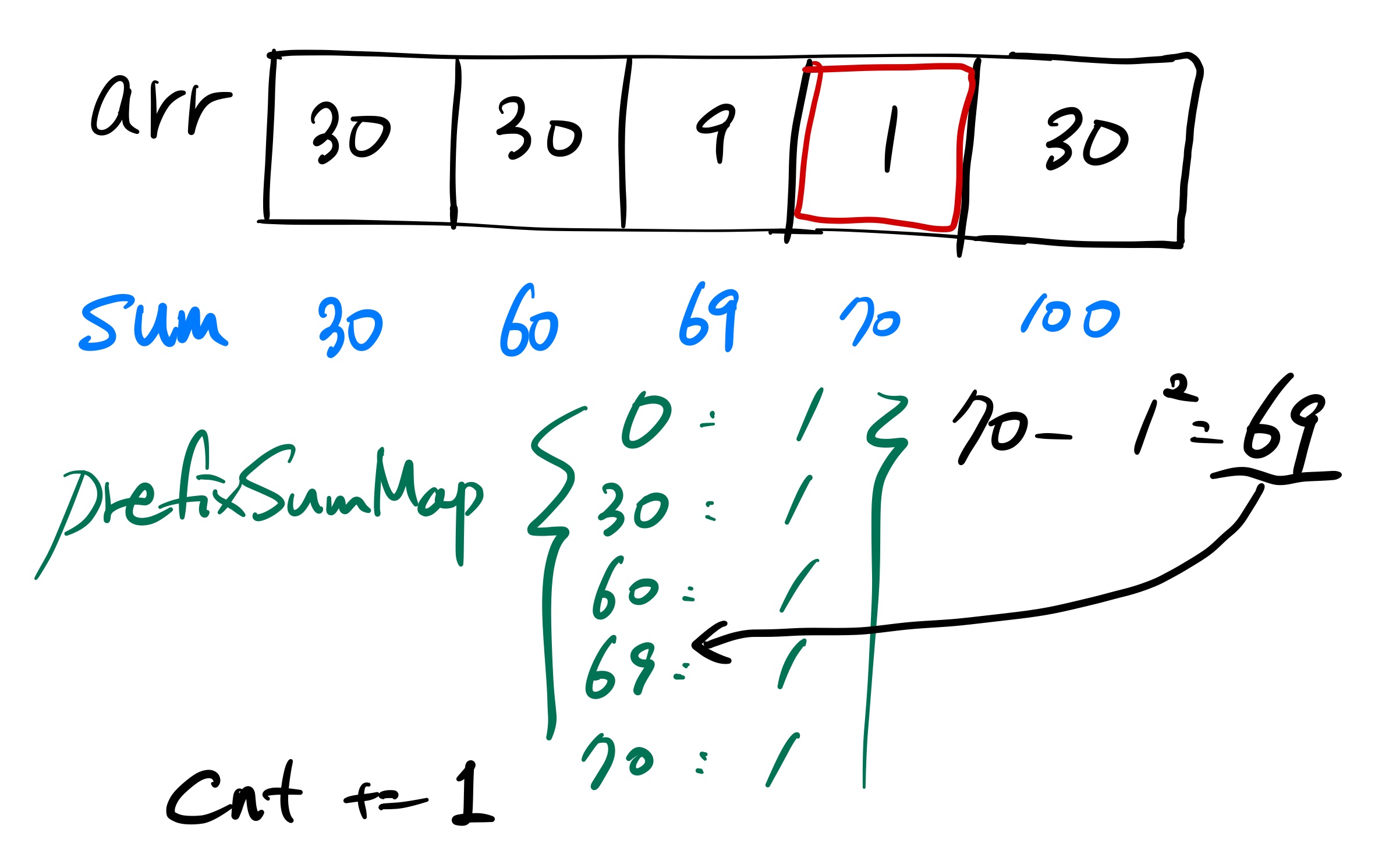 세 번째 원소의 경우는 찾을 수가 있다. prefixSum이 현재 69이고 여기에서 3의 제곱인 9를 빼면 60인데 이 키값은 맵에 있고, 이 키값에 대한 밸류값이 1이므로(즉, 지금까지 한 번만 나왔다는 의미) 구해야 하는 답(cnt)에 1을 더해준다.