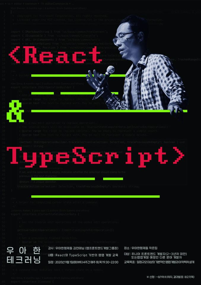 9월에 우아한 테크러닝 3기 교육을 듣게 되었다. 코로나 때문에 온라인으로 진행이 되었고 주 2회, 4주 동안 평일 저녁에 진행되었는데 나와 비슷한 주니어 프론트엔드 개발자들이 많아서 되게 반가웠다. 프론트엔드 개발자가 가져야 하는 기본기에 대해서 우아한형제들의 김민태님이 강의를 해 주셨는데 정말 도움이 많이 되었다. 다만 아쉬운 점은 강의를 끝까지 꾸준하게 듣지는 못한점...? 이것저것 평일에 일이 많이 생겨서 결국 막판에는 많이 놓쳤던 것 같아서 너무너무 아쉽다 ㅠㅠㅠ 교육 관련 포스팅은 여기