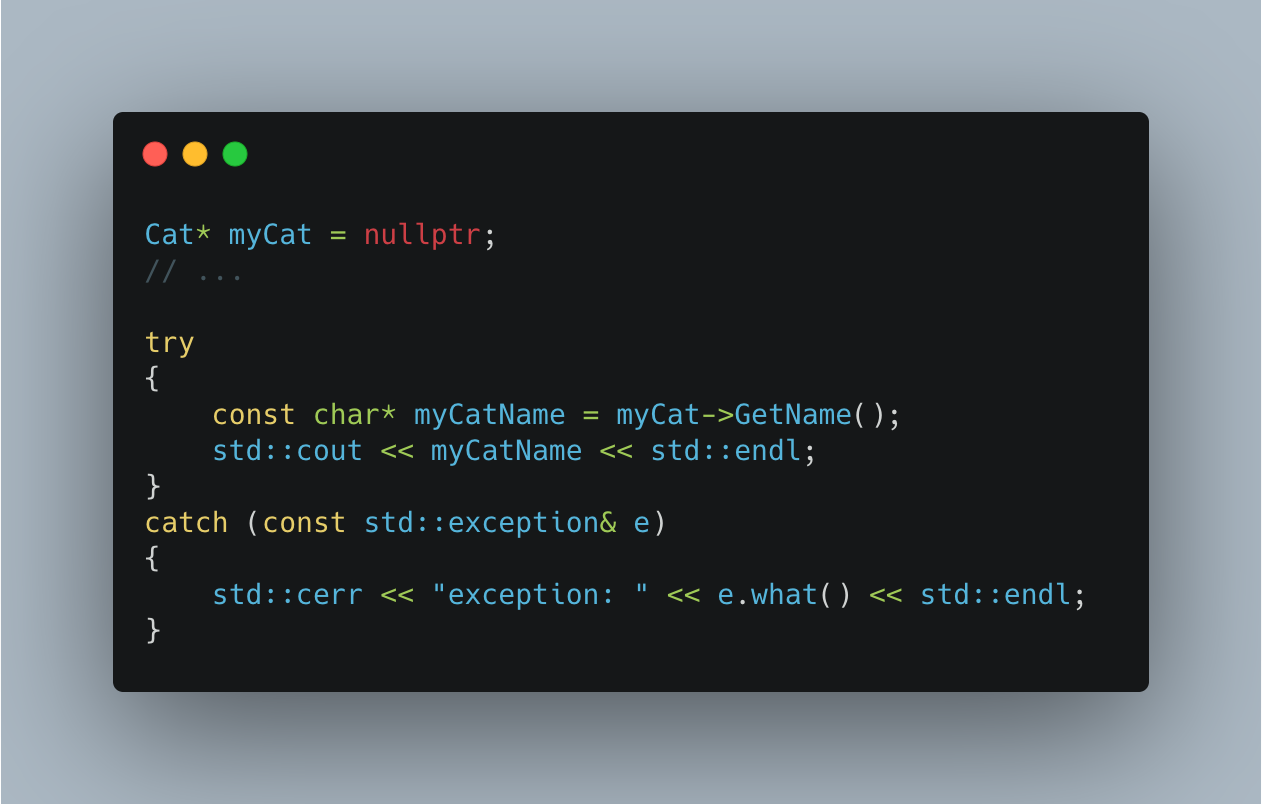 이 경우도 예외가 발생한다. 하지만 C++의 예외가 아니다. 메모리가 0이기에 발생하는 운영체제 상의 에러이다. 이 역시 myCat == NULL인 경우 조건문으로 처리해 주면 해결할 수 있다.