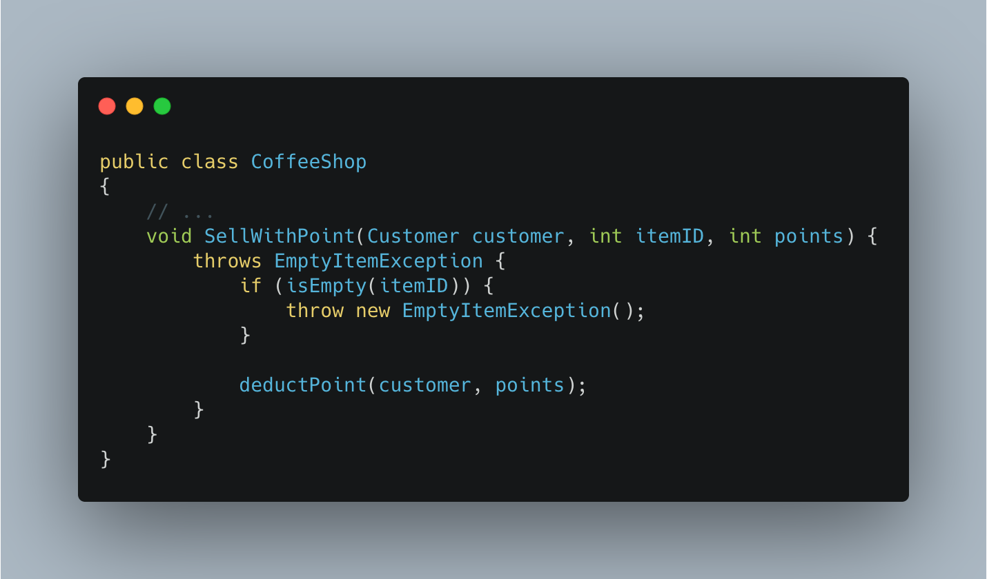 이 코드는 예외 안정성이 보장되지 않았다. 예외 안정성이란 프로그램이 예외 처리 후에 정상적으로 계속 돌아가는 성질을 의미한다. 이 코드에 따르면 커피숍은 커피(아이템)가 없을 때 예외를 던지는데 커피숍이 포인트를 고객으로부터 받고 아이템을 주어야 하는데 예외를 던져서 아이템을 주지 않았다. 그리고 다음 손님을 받는다. 이것은 분명히 잘못된 프로세스이다.