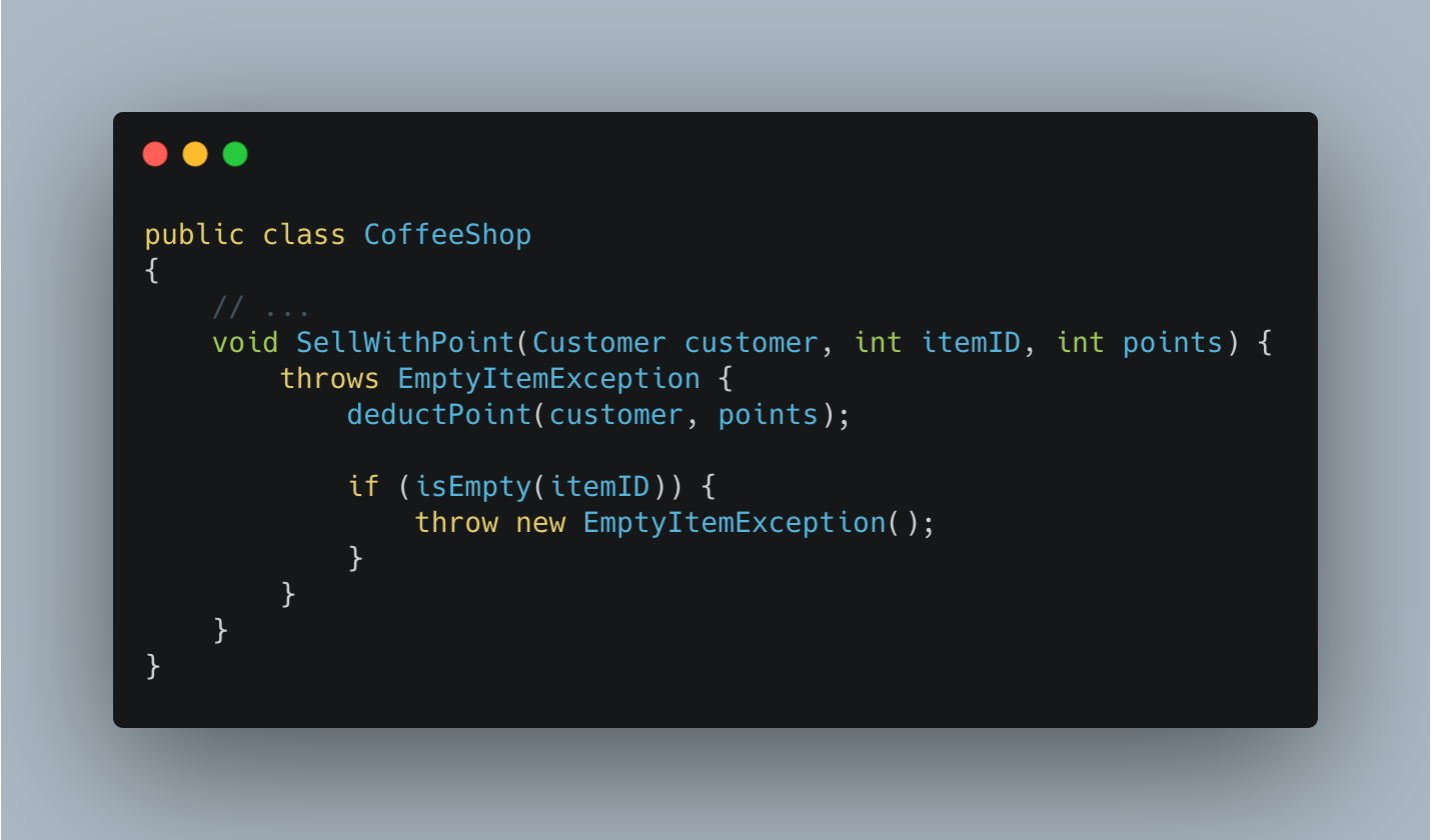 이 코드는 예외 안정성이 보장되지 않았다. 예외 안정성이란 프로그램이 예외 처리 후에 정상적으로 계속 돌아가는 성질을 의미한다. 이 코드에 따르면 커피숍은 커피(아이템)가 없을 때 예외를 던지는데 커피숍이 포인트를 고객으로부터 받고 아이템을 주어야 하는데 예외를 던져서 아이템을 주지 않았다. 그리고 다음 손님을 받는다. 이것은 분명히 잘못된 프로세스이다.
