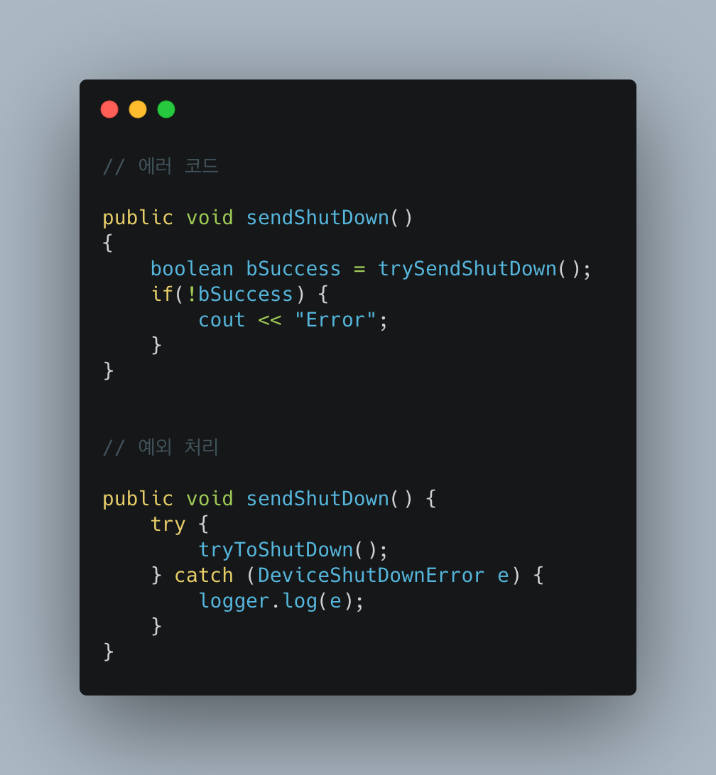 참고로 아래와 같은 코드는 예외라고 부르지 않는다. 예외는 기본적으로 예측할 수 없고, 컨트롤 할 수 없는 상황을 말하는 것이다. 위의 코드는 충분히 컨트롤 할 수 있고 예측할 수 있다.