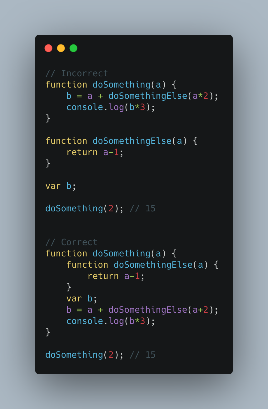 작성한 코드를 함수 선언문으로 '숨기는' 방식은 스코프 버블을 만듦으로써 그 안에서 선언된 변수나 함수 선언문이 이렇게 만들어진 스코프에 묶이게 한다. 왜 이렇게 만들었을까? 여기에는 소프트웨어 디자인 원칙인 '최소 권한의 원칙'과 관련이 있다. 이 원칙은 모듈/객체의 API와 같은 소프트웨어를 설계할 때 필요한 것만 최소한으로 남기고 나머지는 '숨겨야' 한다는 것이다. 이 원칙에 따르면 아래에 코드를 어떻게 리팩토링 해야 하는지를 알 수 있다.