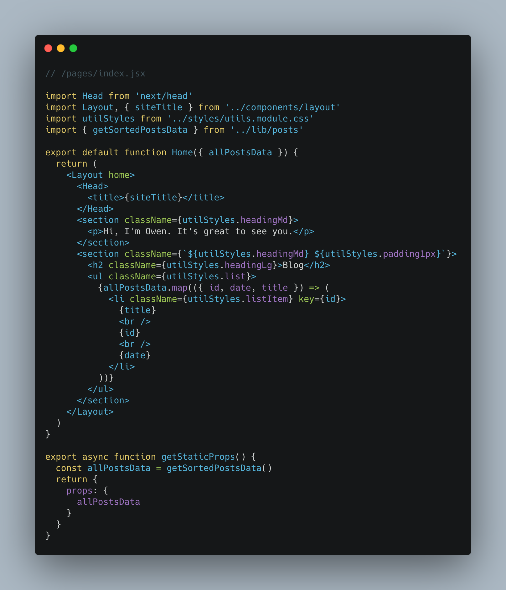 /lib/posts.js에서는 게시물의 모든 Id가 담긴 배열을 만들어주는 getAllPostIds 함수와 id 값을 가지고 포스트 데이터를 얻는 getPostData 함수를 각각 구현해 준다.