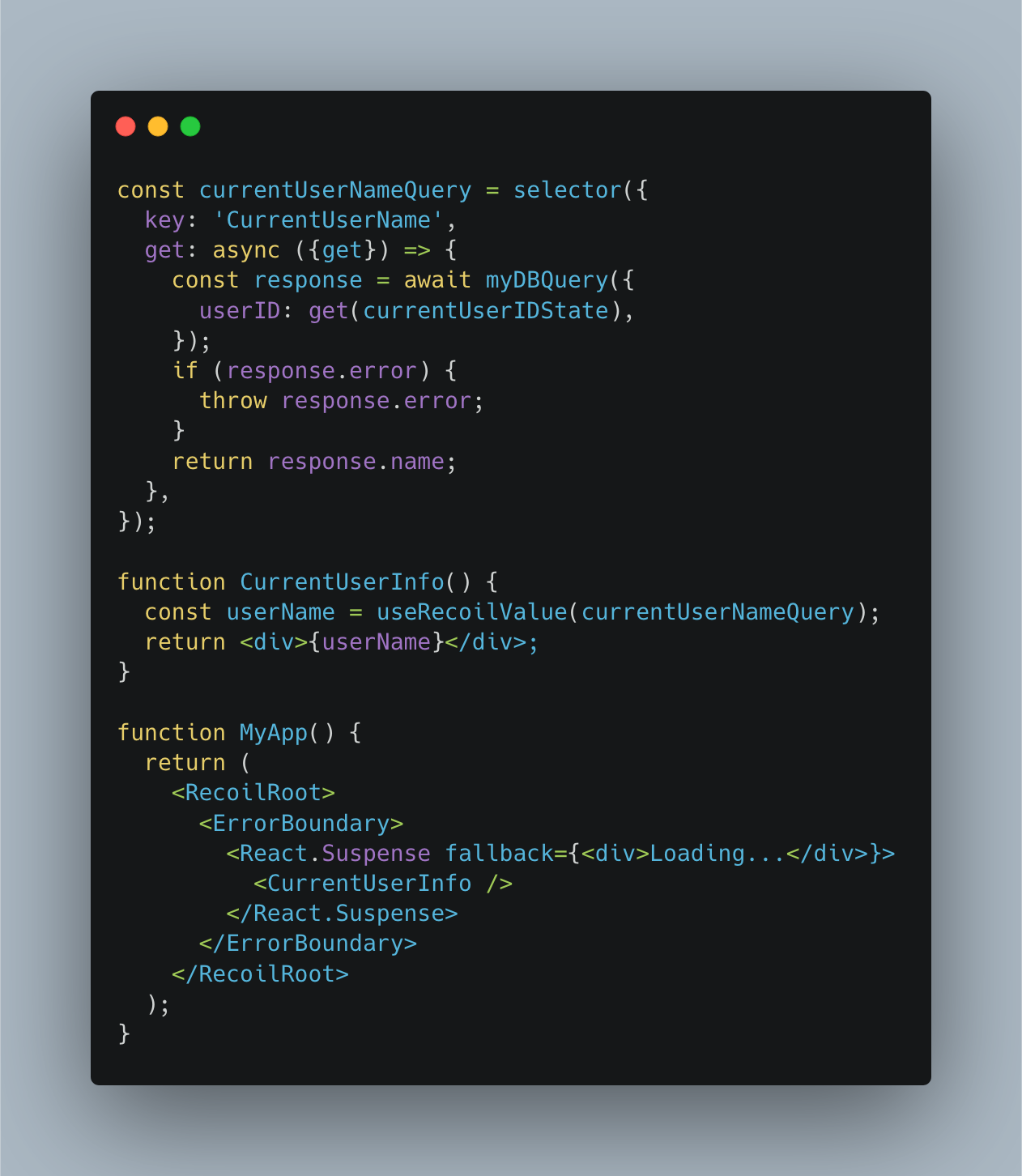 만약 요청이 에러가 있다면? 리코일 선택자는 그 값을 사용하려 할 때 에러를 반환한다. 그리고 이는 <ErrorBoundary>로 감싼다.
