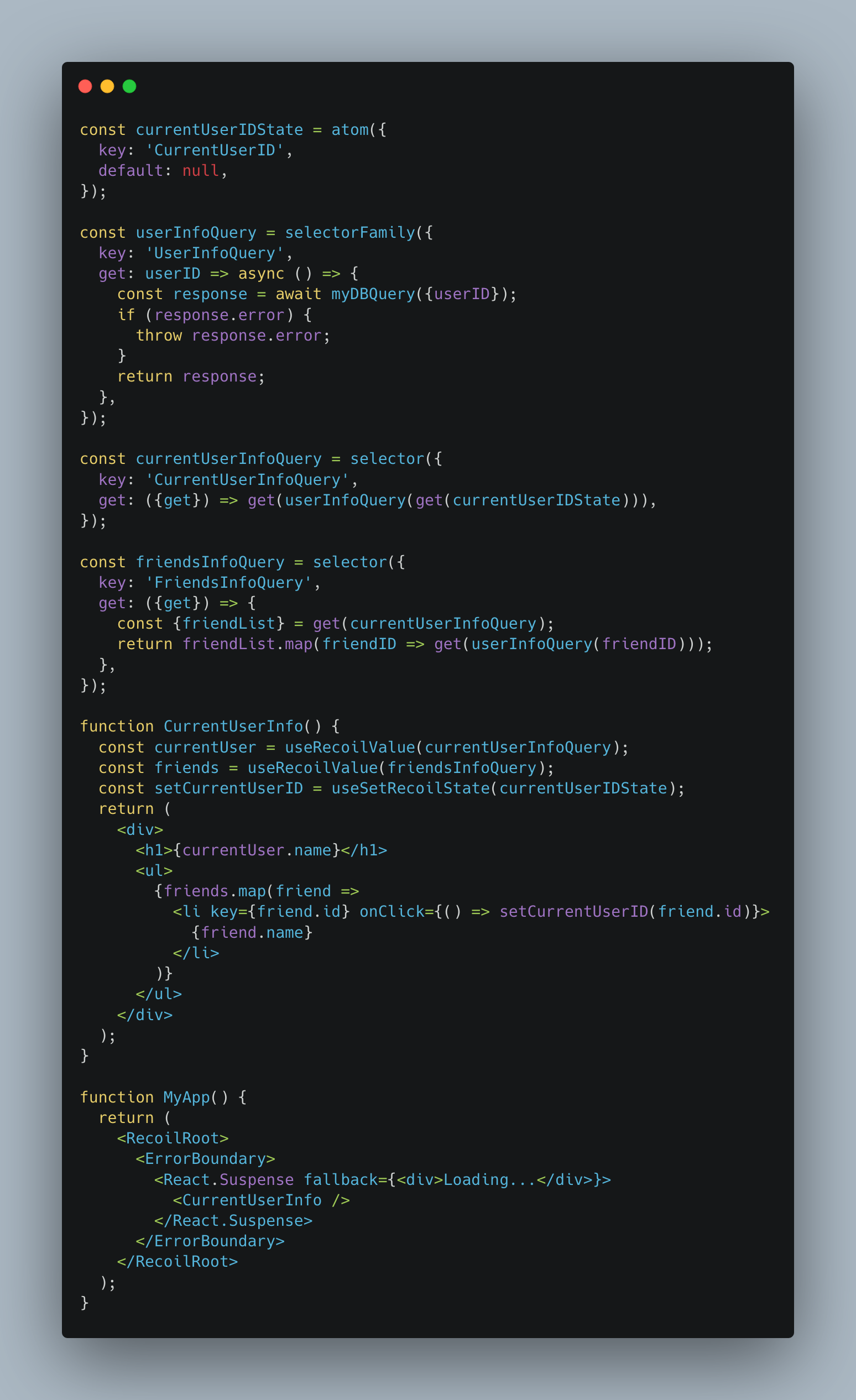 기억해야 할 것은 선택자로 쿼리를 모델링함으로써, 우리는 혼성 상태, 파생된 상태 그리고 쿼리에 대한 데이터 흐름 그래프를 만들 수 있다. 이 그래프는 상태가 업데이트 될 때 마다 자동적으로 리액트 컴포넌트를 업데이트 하고 리렌더링 할 것이다. 아래 예제는 현재 유저 이름과 그들의 친구들 리스트를 렌더링할 것이다. 친구 이름을 클릭하면 그들이 현재 유저가 되고 자동으로 리스트는 업데이트가 될 것이다.
