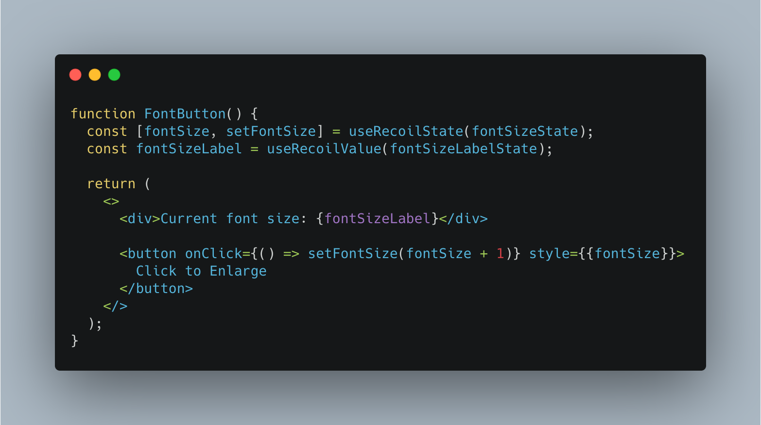 get 프로퍼티는 계산이 되어야 하는 함수이다. 아톰과 다른 선택자에 접근할 수 있는데 get의 매개변수(argument)로 넘겨서 할 수 있다. 다른 아톰이나 선택자에 접근할 때 마다 의존성 관계가 만들어져서 다른 아톰을 업데이트하거나 선택자가 다시 계산이 되기도 한다. 선택자는 useRecoilValue()를 가지고 읽혀질 수 있다. 이 메서드는 아톰과 선택자를 매개변수로 받아서 상응하는 값을 반환한다.
