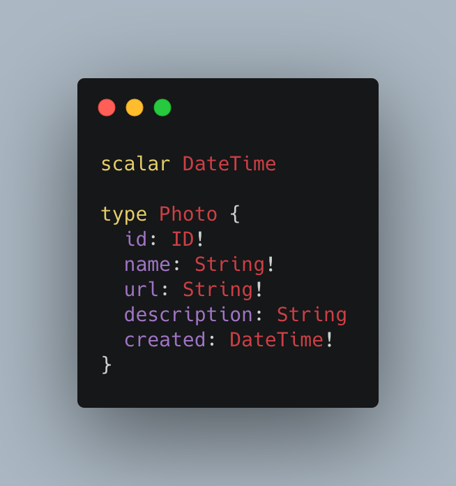 사진 공유 어플리케이션의 주요 타입은 User와 Photo이다. 먼저 타입의 경우 필드들로 이루어져 있으며 필드는 각 객체의 데이터와 관련이 있고 특정 종류의 데이터를 반환한다. Photo 타입의 경우 id, name, url, description 등의 필드가 들어갈 수 있을 것이다.