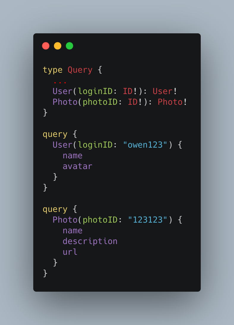 GraphQL 필드에는 인자를 추가할 수 있다. 인자를 사용하면 데이터를 전달할 수 있기 때문에 GraphQL 요청 결과 값이 바뀔 수도 있다. 예를 들어 특정한 한 명의 사용자에 대한 이름과 아바타를 선택한다든지, 특정한 사진 한 장의 세부 정보를 받아 보려면 각각 loginID와 photoID를 전달하면 된다.