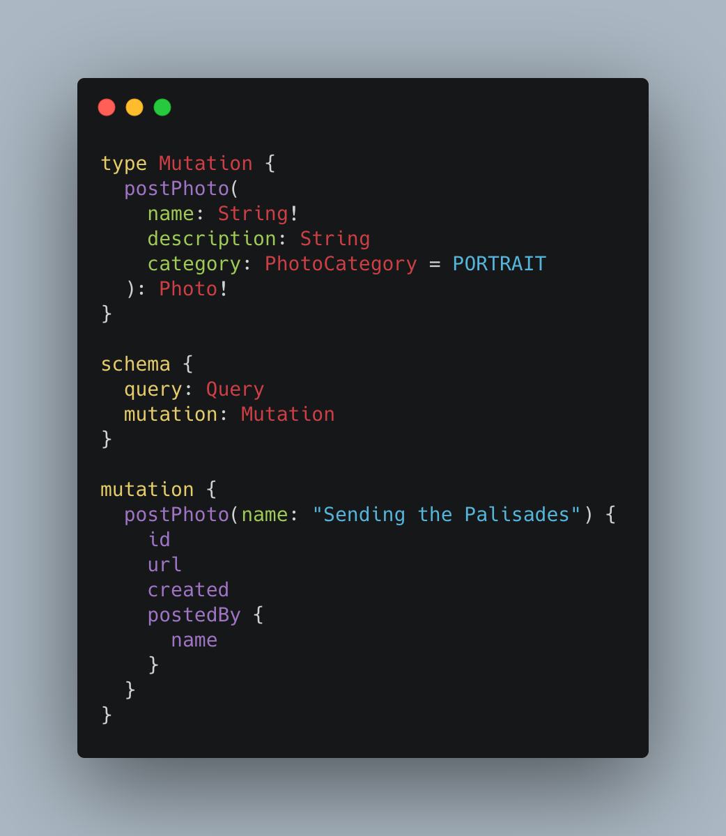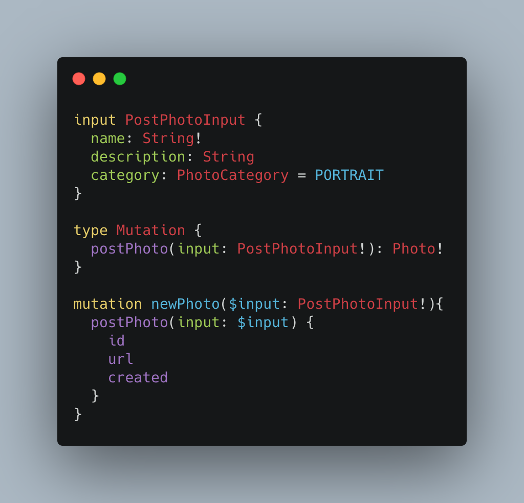 뮤테이션은 스키마의 루트 mutation 타입에 추가하여 클라이언트에서 사용할 수 있도록 한다. 사진을 게시하는 postPhoto라는 뮤테이션을 만들어 보자. 참고로 뮤테이션을 사용할 때는 데이터를 대량으로 만들어야 할 때가 많으므로 변수를 선언하는 편이 좋다.
