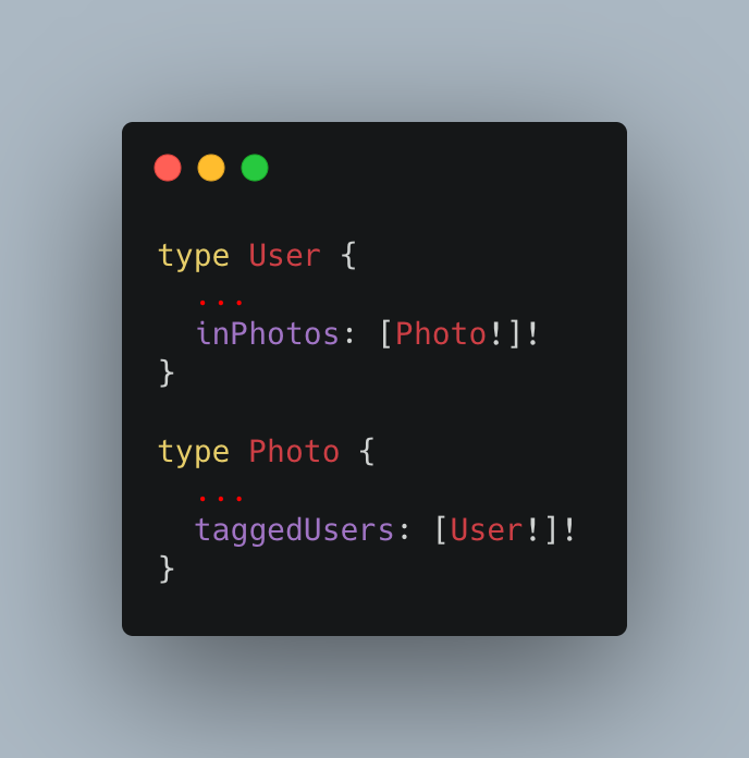 - 일대일 연결: 하나의 객체 타입이 또 다른 객체 타입과 서로 연결된다. 사진 한 장과 유저 한 명이 연결된다.