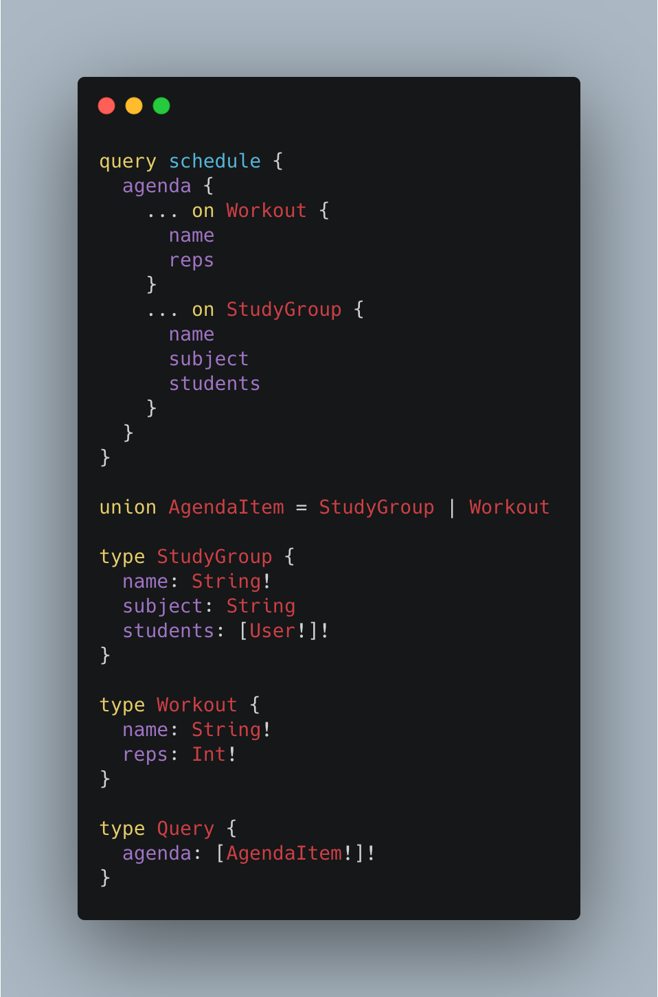 GraphQL 리스트에 항상 같은 타입만 들어가는 것은 아니다. 유니언 타입(Union Type)이나 인터페이스(Interface)를 사용하면 여러 타입을 가지고 쿼리를 만들 수 있다. 먼저 유니언 타입을 살펴보자. 유니언 타입을 사용하면 여러 타입 가운데 하나를 반환할 수 있다. 일정이 스터디 그룹일 때와 운동일 때 각각 반환되는 일정 필드가 달라지는 예제를 한 번 살펴보자.