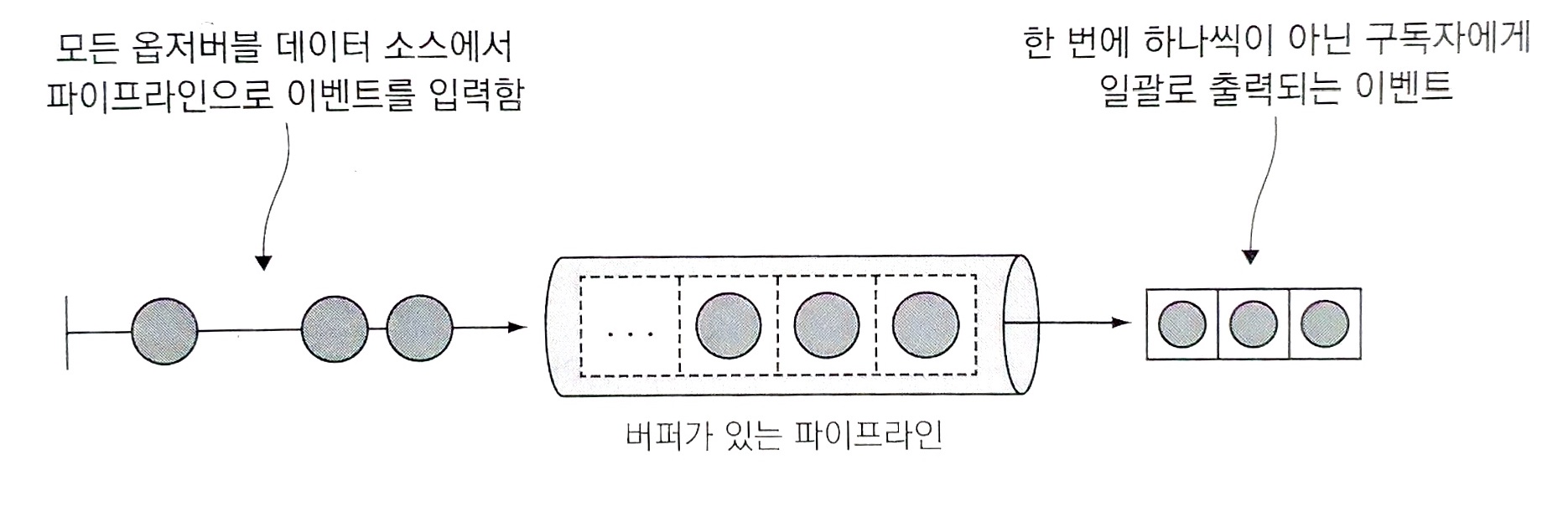 RxJS는 이벤트 홍수를 한 번에 처리하지 않고 마우스 움직임과 클릭, 키 입력 같은 이벤트를 임시로 캐싱하고 구독자에게 브로드캐스팅 하기 전에 비즈니스 로직을 이벤트에 적용하는데 유용하다. 버퍼링 연산자는 과거 데이터를 일시적으로 저장하는 기본 데이터 구조를 제공하므로 아래 그림과 같이 한꺼번에 작업을 할 수 있다.