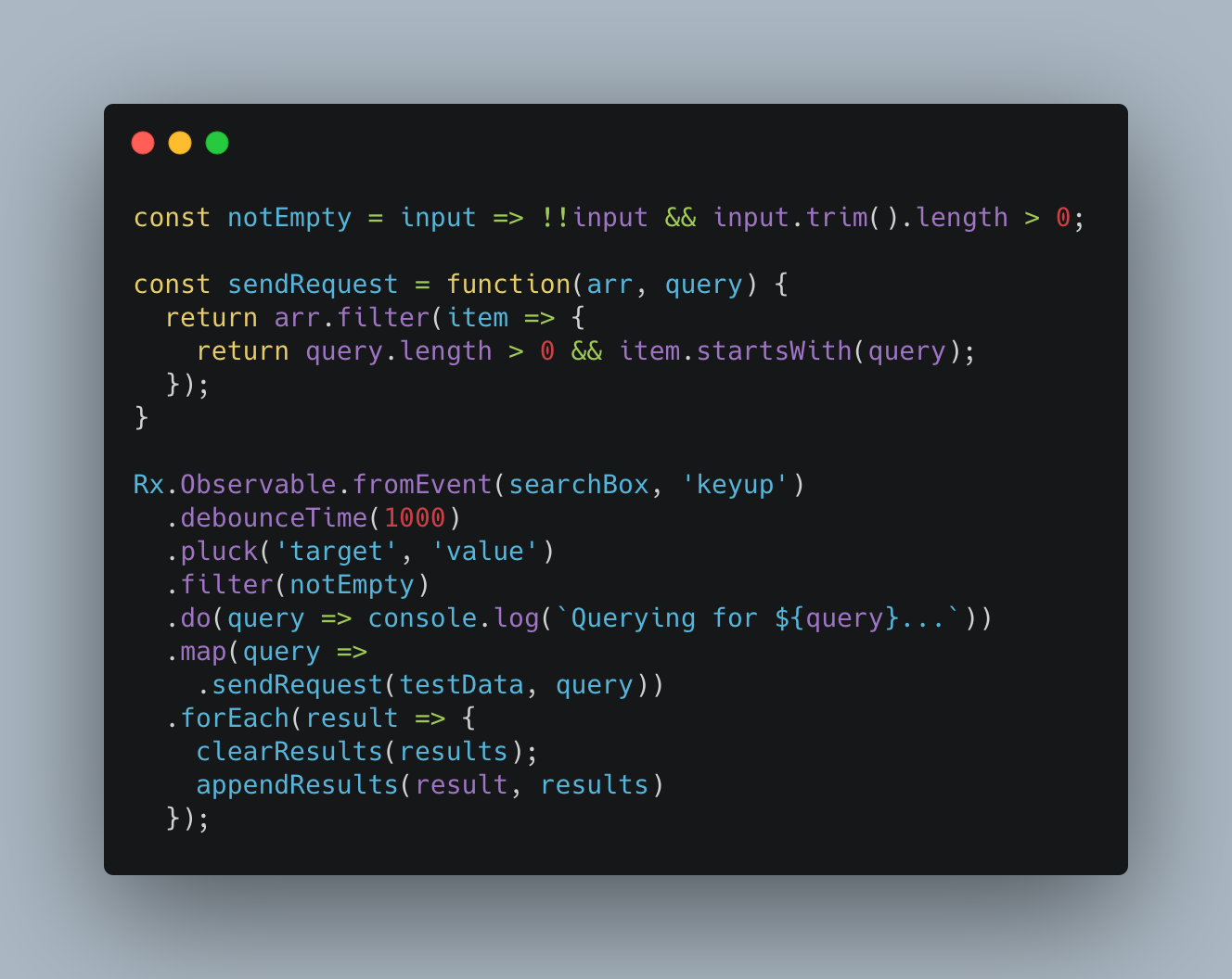 반응형으로 생각할 때 디바운싱 연산은 간단히 처리 파이프라인 안에 내장된 필터라고 볼 수 있다. 처리 파이프라인은 옵저버에서 특정 이벤트를 제거할 때 시간을 사용한다. 그러므로 옵저버블을 사용하여 스트림에 일급 객체로서 시간을 명시적으로 주입할 수 있다. 이에 대한 함수형 버전에서는 sendRequest()를 보다 간결하고 순수하게 만들고 debounceTime()으로 모든 디바운싱 로직을 구현한다. 아래 예제는 함수형-반응형 버전이다.