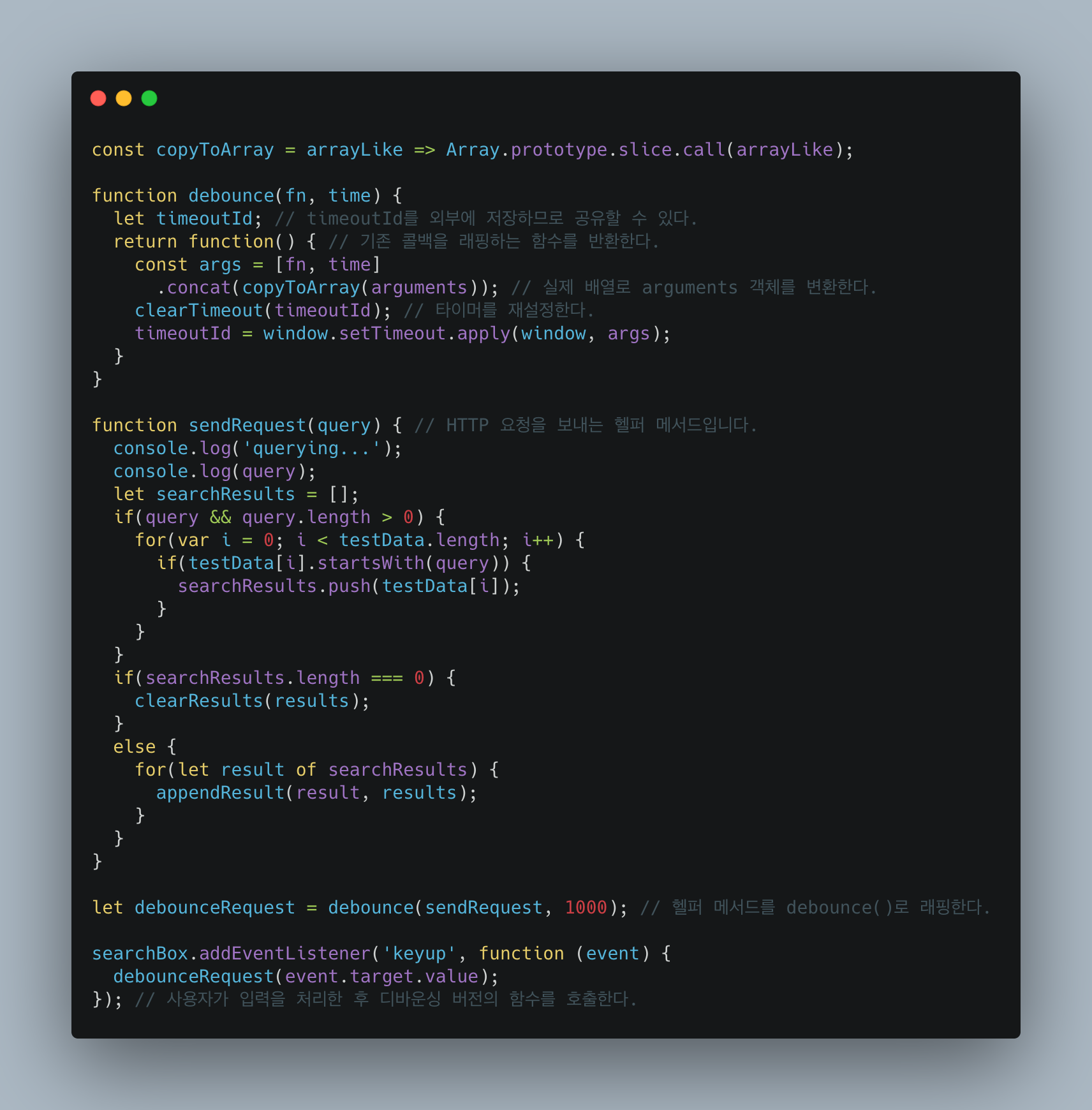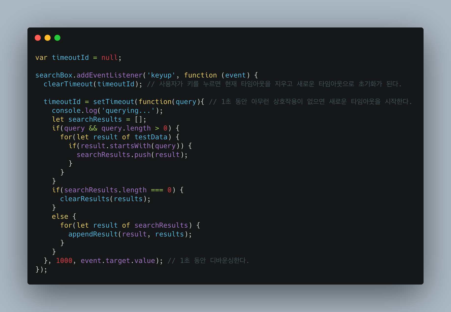 사용자가 키를 입력할 때마다 해당 키 입력 이벤트가 이벤트 리스너를 작동시킨다. 이벤트 리스너 내부에서 clearTimeout()으로 기존에 보류한 타임아웃을 지운다. 그리고 타이머를 재설정 한다. 이 모든 결과는 입력이 끝나거나 입력 사이에 지연이 있을 때 까지 작업이 실행되지 않음을 의미한다.