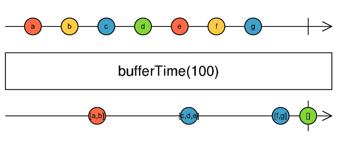 - bufferTime(time) : 일정 기간 소스의 이벤트를 버퍼링한다. 시간이 지나면 데이터가 방출되고 새 버퍼가 내부적으로 초기화된다.