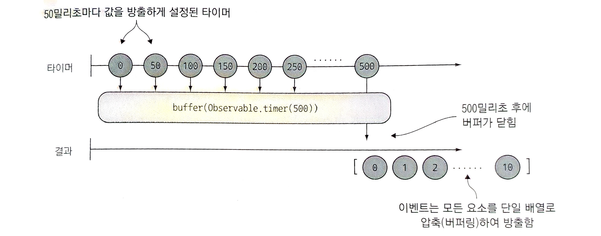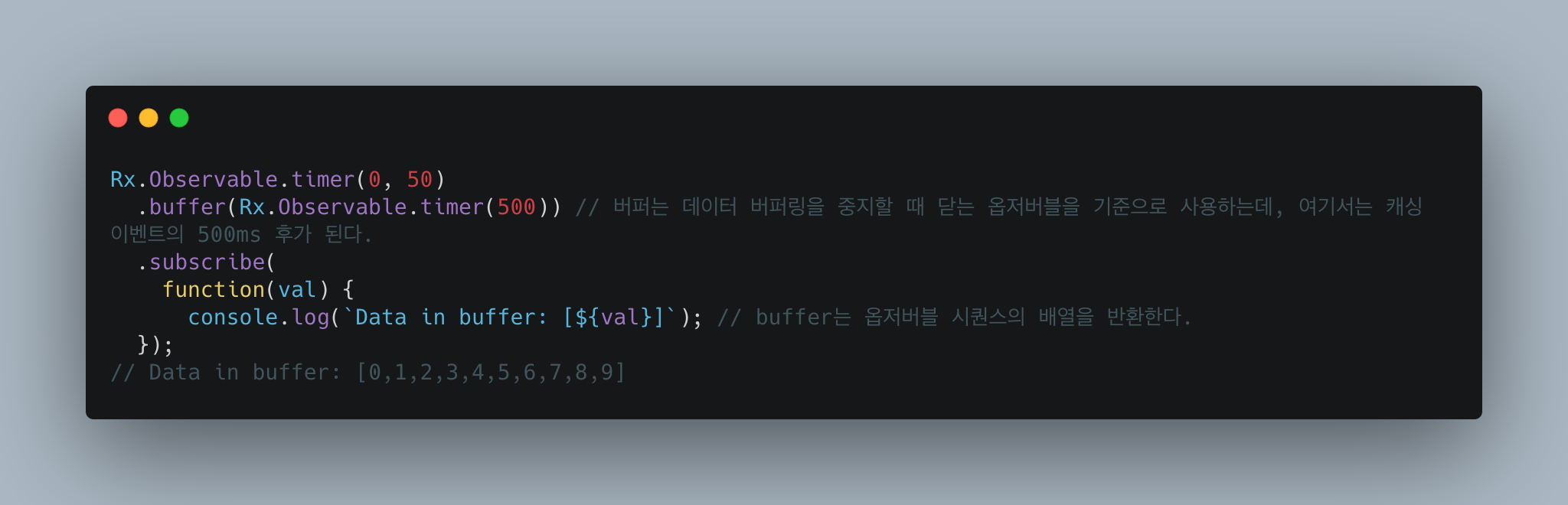 buffer()는 닫는 옵저버블이라고 하는 전달된 옵저버블이 이벤트를 방출할 때까지 버퍼에서 소스 옵저버블이 방출한 이벤트를 수집한다. 이 시점에서 buffer()는 버퍼링된 데이터를 비우고 내부적으로 새 버퍼를 시작한다. 아래의 예제는 50ms 마다 타이머가 후속 값을 방출한다. 그리고 500ms의 옵저버블 닫기 타이머로 이벤트를 버퍼링한다. 따라서 500/50 = 10개의 이벤트가 한 번에 방출이 된다.