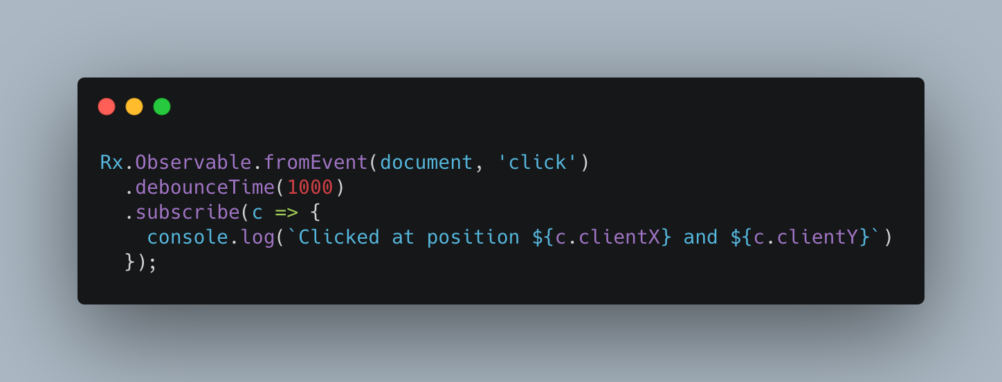 아래 예제는 빠른 연속 클릭 후 가장 최근 클릭을 방출하는 디바운싱 연산자를 보여주는 간단한 예제 코드이다. 사용자는 클릭 이벤트를 생성할 수 있지만, 비활성 상태로 1초가 지나면 마지막 이벤트만 방출이 된다.