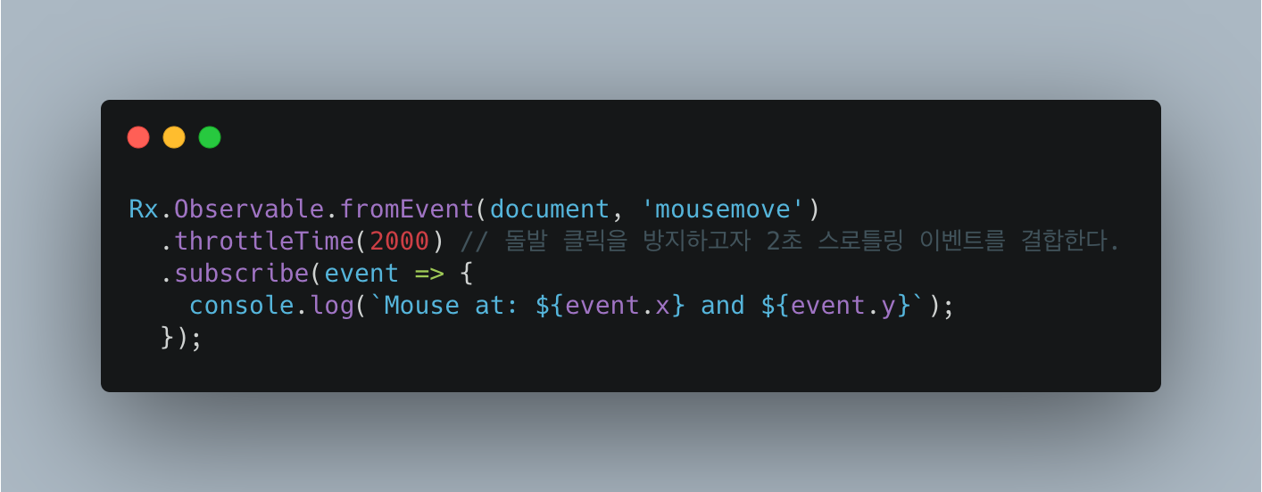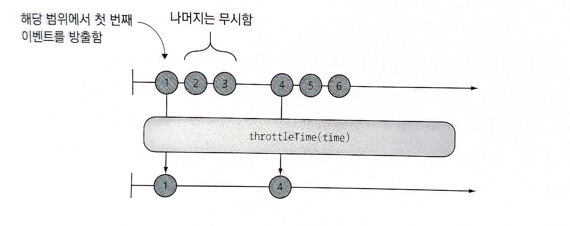 스로틀링은 일정 시간 뒤에 다른 값이 따라오는 옵저버블 시퀀스의 값을 무시한다. 다시 말하면 아래의 그림처럼 매 회 한 번만 함수를 실행한다.