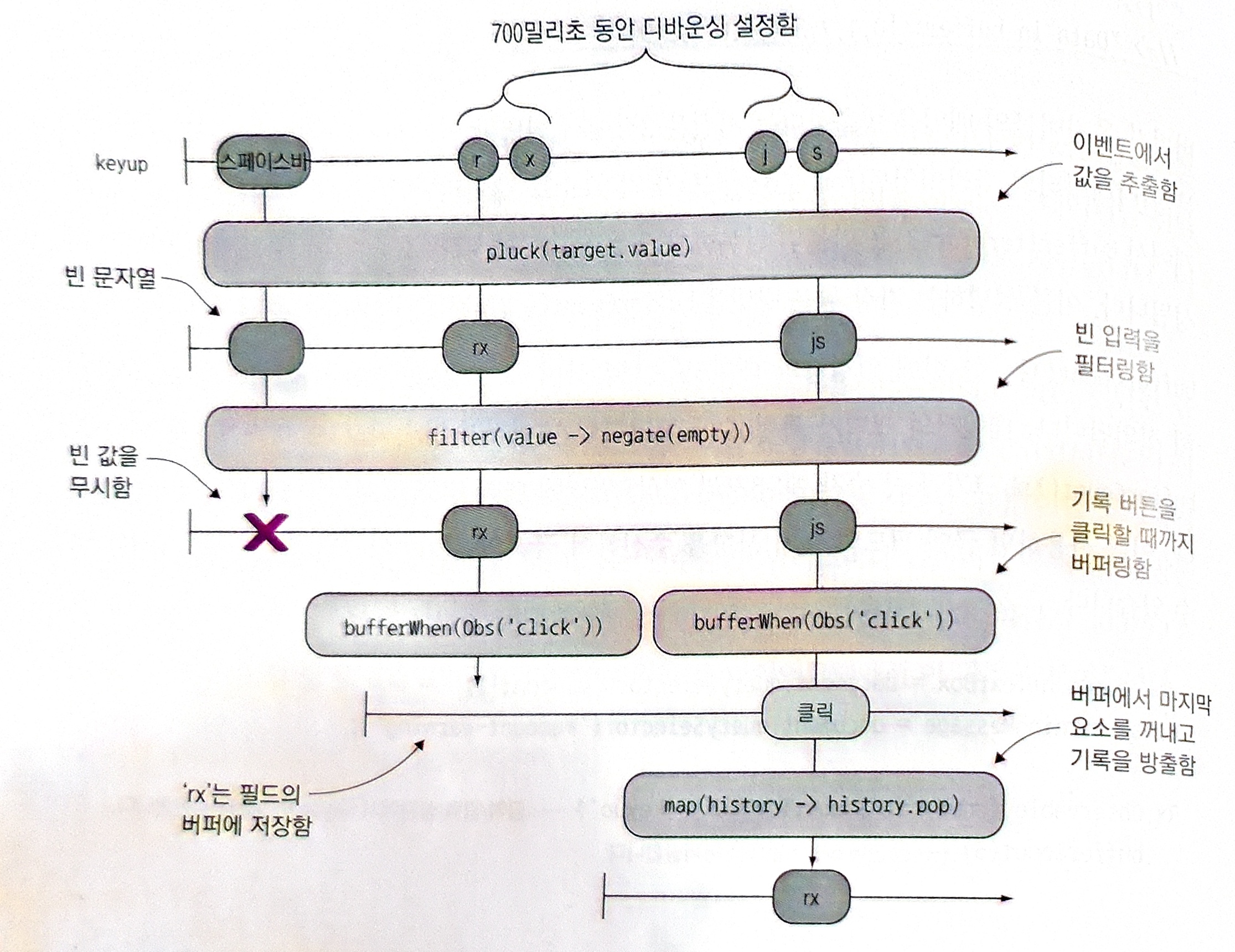 위의 프로그램의 목표는 값을 폼 필드에 입력할 때 버퍼에 이를 보관하여 원하면 언제든지 값으로 되돌리는 것이다. 키 입력을 수신하는 스트림은 0.5초가 조금 넘는 시간에 이벤트를 캡쳐하기 위해 디바운싱한다. 입력된 단어는 간단한 유효성 검사를 거치며, 데이터는 버퍼를 채우고 기록을 요청할 때만 비워지고, 이 옵저버블은 버퍼를 닫고 기록을 출력한다.