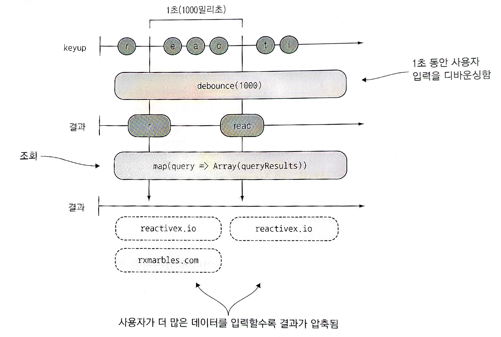 이 방식의 장범은 다른 연산자들과 마찬가지로 debounceTime()은 단순히 스트림에 삽입된다. RxJS의 시간 추상화를 통해 다른 모든 연산자와 함께 시간을 완벽하고 투명하게 도입할 수 있다. 아래의 그림은 디바운싱이 스트림으로 전달되는 사용자 입력에 미치는 영향을 보여준다.