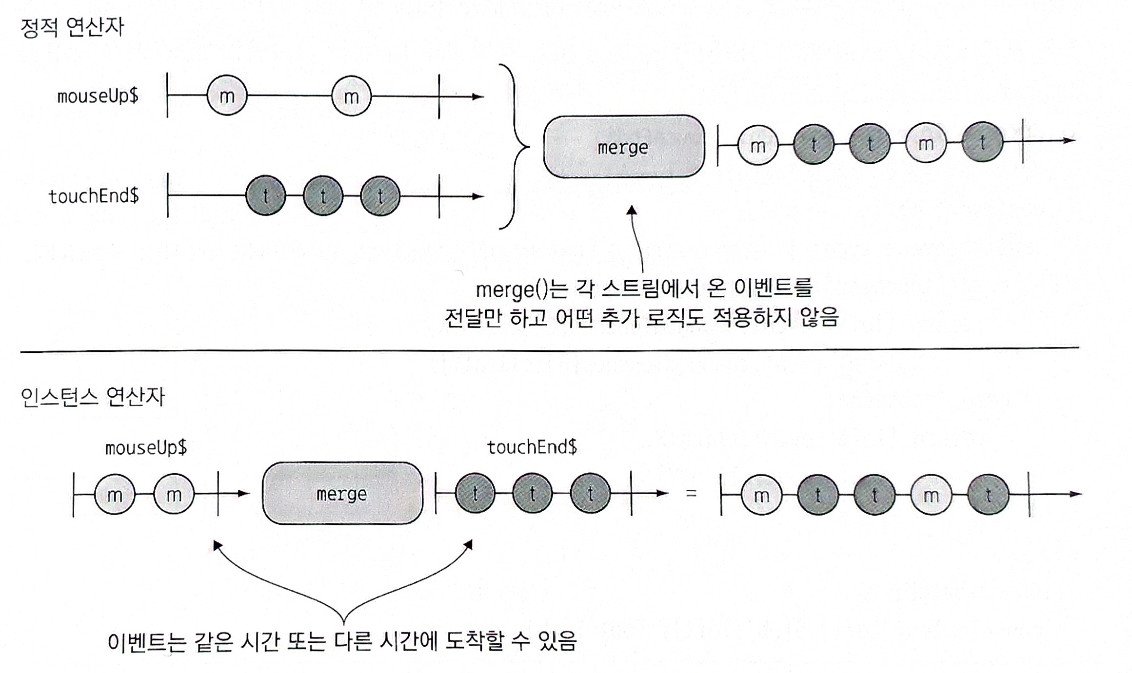 두 스트림 사이에서 merge() 연산자가 정적 형식일 때와 인스턴스 형식일 때 다음과 같이 차이를 확인해 볼 수 있다.