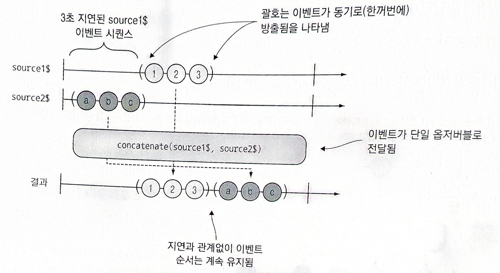 위의 예제에서 첫 번째 스트림이 3초 지연되므로 a,b,c가 먼저 방출 된다고 예상하지만 concat은 순서를 유지하기 때문에 다음 스트림을 추가하기 전에 첫 번째 스트림을 완료한다.