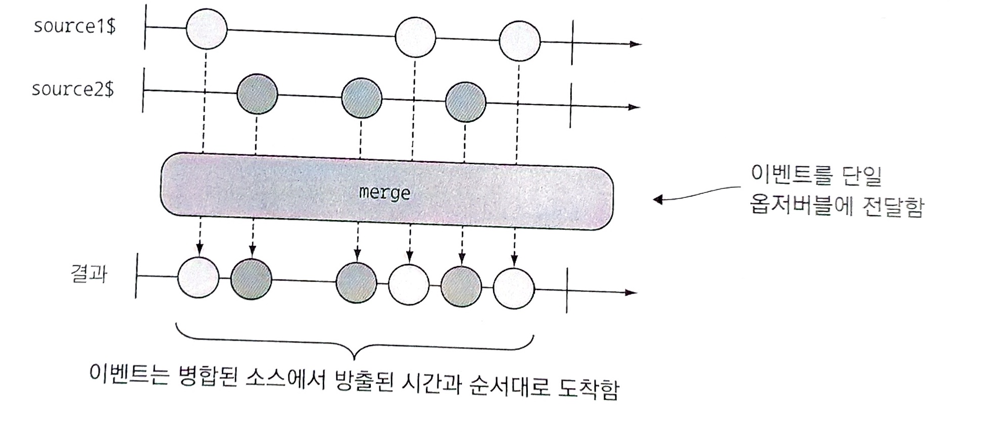 다중 스트림을 결합하는 가장 간단한 연산자는 merge()이며 이해하기가 쉽다. 이 연산자를 사용하는 목적은 깔때기처럼 다중 스트림의 이벤트를 도착한 순서대로 하나의 옵저버블에 전달하는 데 있다. merge()는 두 이벤트에서 OR 연산을 수행하는 것과 같다.