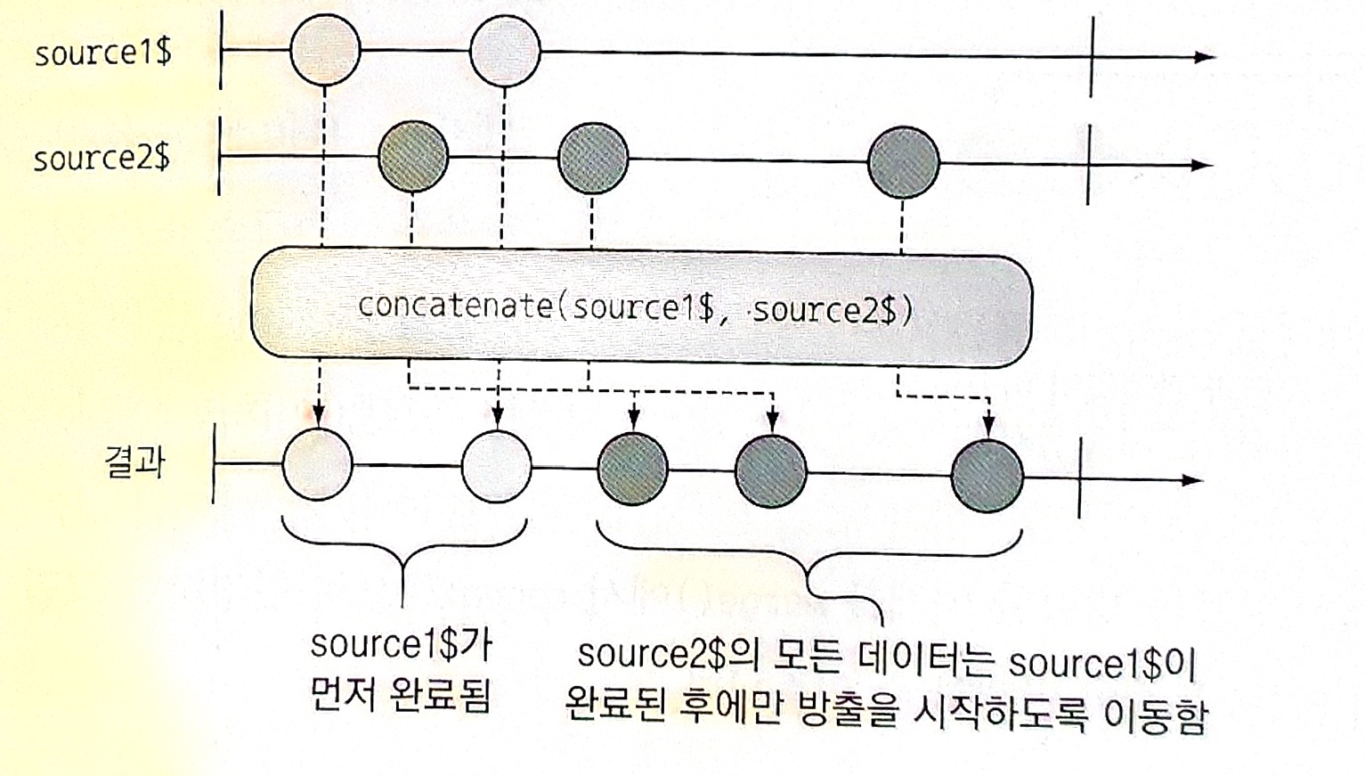 merge() 연산자는 소스 스트림에서 이벤트를 받는 순서대로 모든 옵저버블 데이터를 출력하는 방식을 사용한다. 그러나 어떤 시나리오에서는 인터리빙 하는 대신 옵저버블 시퀀스 전체의 순서를 유지하는데 관심이 있을 수 있다. 즉 옵저버블 두 개가 있을 때 하나에서 모든 이벤트를 받은 다음에 그 다음 옵저버블에서 이벤트를 받는 식인 것이다. 이러한 유형의 작업을 두 스트림의 연결(concatenation)이라고 한다.