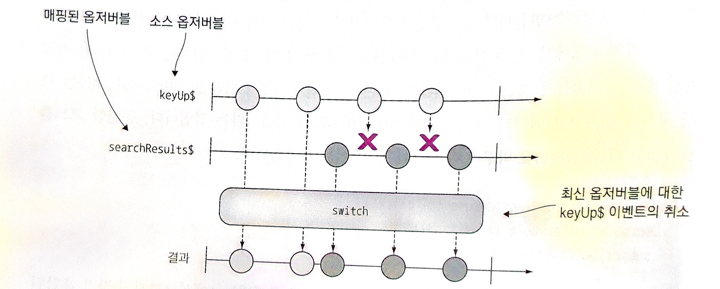 switch()는 검색 스트림에 적합한 연산자이다. 검색 스트림에 적합한 이유는 keyup 이벤트가 곧바로 실행되어서 옵저버에 데이터를 주입할 필요가 없기 때문이다. 옵저버블에 소스를 매핑할 때 switch()는 새 구독이 들어오면 이전 구독을 취소한다. 이러한 방식으로 다운스트림 옵저버블은 오래되었거나 더 이상 관심 없는 연산자를 제거하여 항상 최신 데이터를 취할 수 있다.