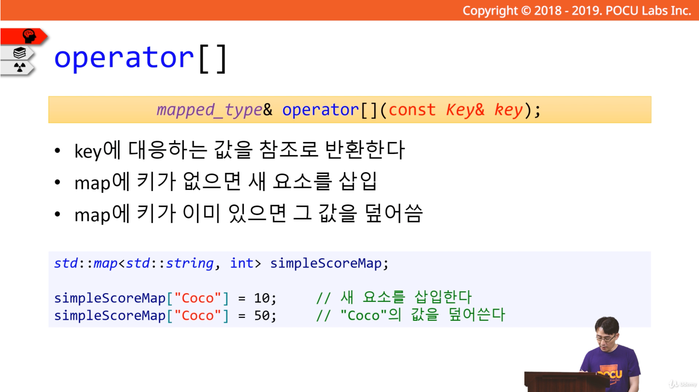 맵에서 키에 해당되는 값을 참조로 반환할 때 operator[](배열)를 사용한다. 만약에 그 키 값이 없는 경우라면 새 요소를 삽입하며, 기존에 키가 이미 있으면 그 값을 덮어쓰게 된다.