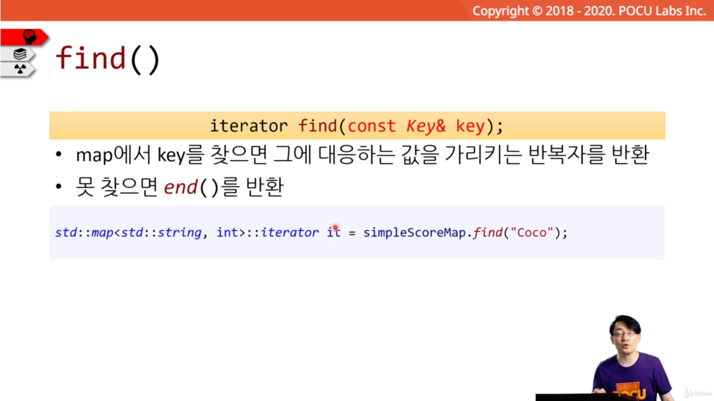 맵에서 특정 key 값을 가지고 그에 대응하는 value를 찾기 위해서 사용하는 메서드가 find() 메서드이다. 만약 찾지 못하면 end()를 반환한다.