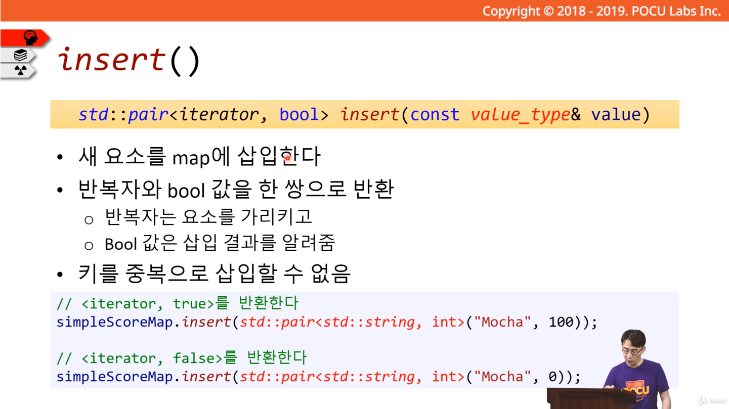 맵에 새로운 요소를 삽입하려고 할 때에는 insert() 메서드를 사용한다. 이 때 반환은 반복자(iterator)와 bool 값을 하며 키를 중복으로 삽입할 수 없다.