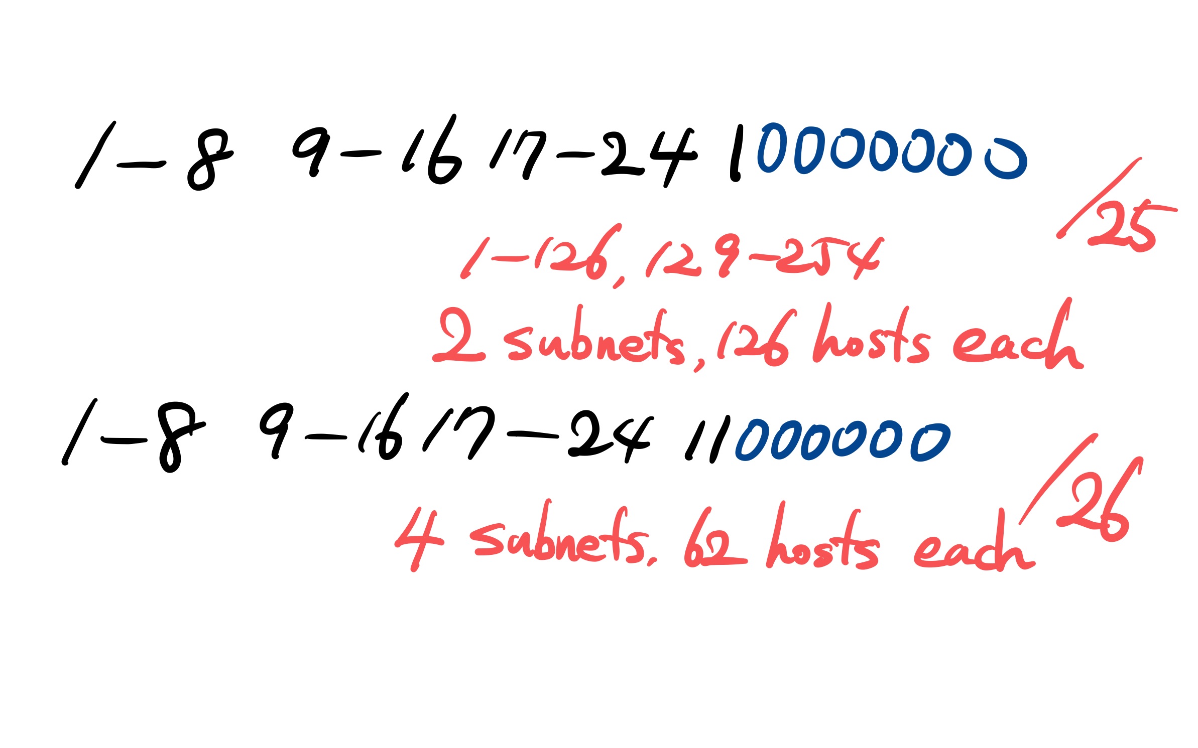 위의 그림처럼 서브넷마스크가 /25이면 IP 주소의 마지막 값을 1-126, 129-254 이렇게 두 가지 서브넷 마스크로 가질 수 있고, 각각의 서브넷 마스크는 126개의 호스트를 가진다. 그리고 /26이면 4개의 서브넷 마스크와 각각 62개의 호스트를 가지게 된다.