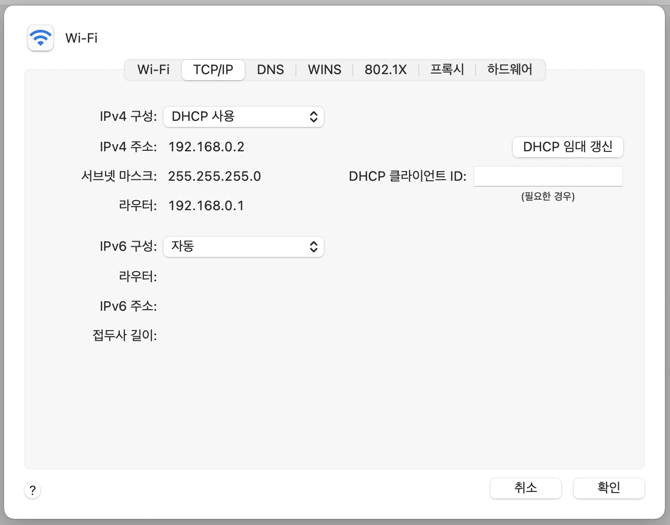 맥 OS의 경우 시스템 환경 설정 > 네트워크 > 고급 으로 들어가면 다음과 같이 네트워크 정보를 확인할 수 있다.