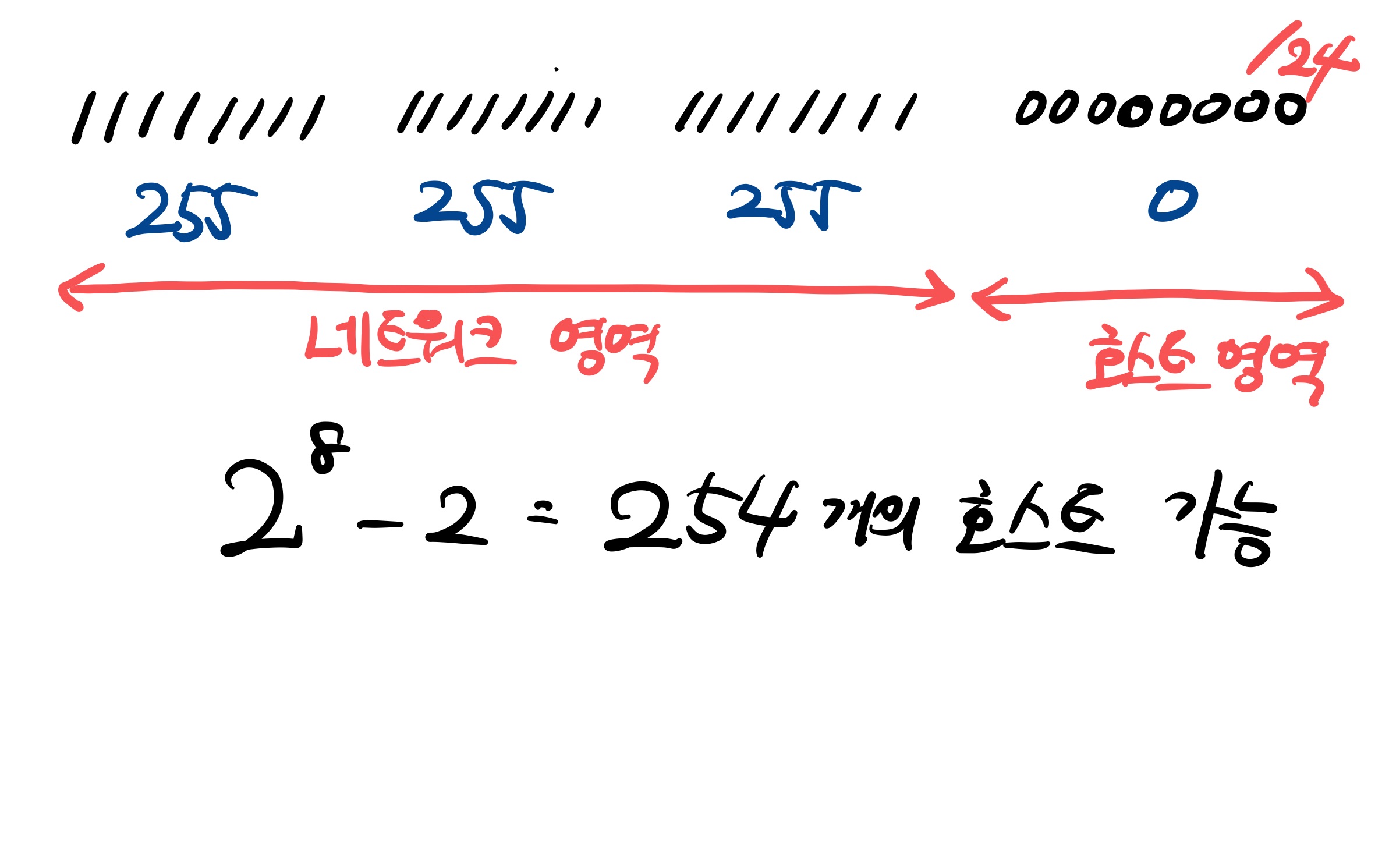 - 클래스 A : 가장 앞자리가 0-126, 서브넷마스크 /8
