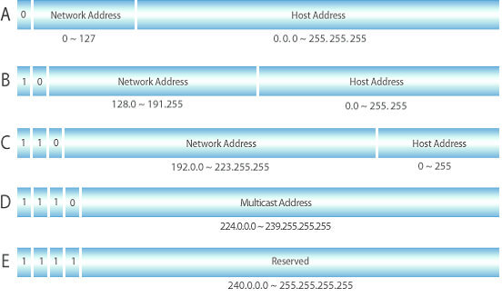 IP 주소는 클래스를 바탕으로 서브네팅을 할 수도 있고 클래스를 사용하지 않고 서브네팅을 할 수도 있다. 먼저 클래스로 서브네팅을 하면 다음과 같이 클래스를 나눌 수 있다.