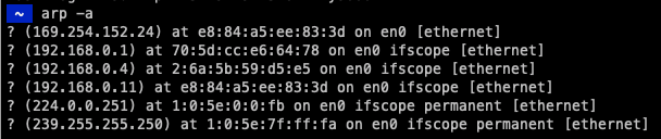 arp -a 명령어를 입력하면 네트워크에 캐시되어 있는 arp들이 나타난다. 왼쪽의 값(169.254.152.24)은 IP 주소이고 중간에 있는 값(e8:84:a5:ee:83:3d)은 물리적 네트워크 주소이다. arp 요청은 네트워크의 브로드캐스트 요청이다.