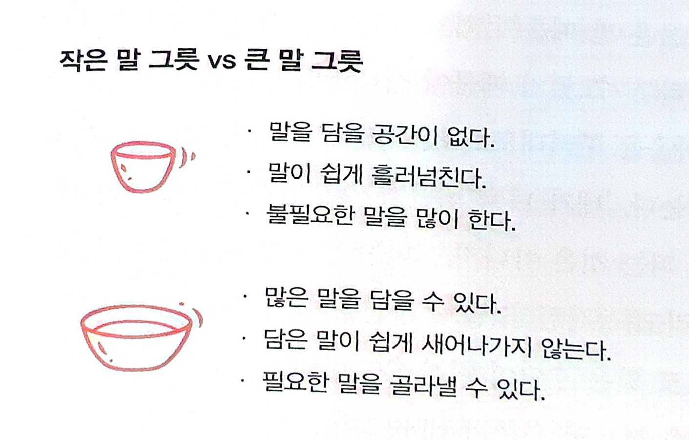 이 책에서 저자가 말그릇이 작은 사람과 말그릇이 큰 사람을 비교한 부분은 나에게 인상적이었다. 나도 말을 하다보면 때로 불현듯이 '아 내가 뭔가 말을 잘 못하고 있다'라는 느낌을 받을 때가 종종 있다. 상대방의 생각과 감정은 고려하지 않은 채 내가 하고 싶은 말만 뱉어내기 바쁘다. 내 말이 다 옳고 상대방은 이 '옳은 말'을 아직 모른다고 착각했기 때문이다. 저자는 책에서 말에 대해 이렇게 설명한다.