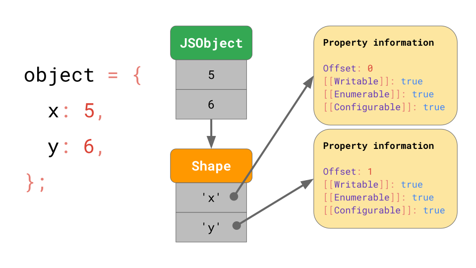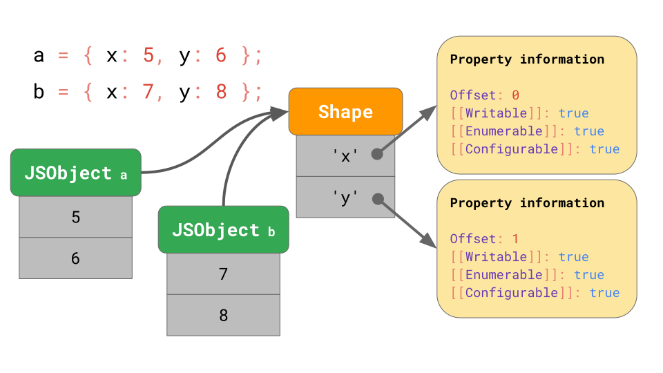 이러한 속성값은 메모리 어느 곳에 저장해야 할까? 만약 JSObject의 일부로 저장한다면 나중에 이 shape의 object를 다시 사용하게 될 때 property 이름이 동일한 object가 반복되므로, property 이름과 attribute를 포함하는 전체 딕셔너리 구조를 JSObject 자체에 저장하는 것은 메모리 낭비가 될 수 있다. 그러므로 최적화로서 자바스크립트 엔진은 object의 shape를 별도로 저장한다.