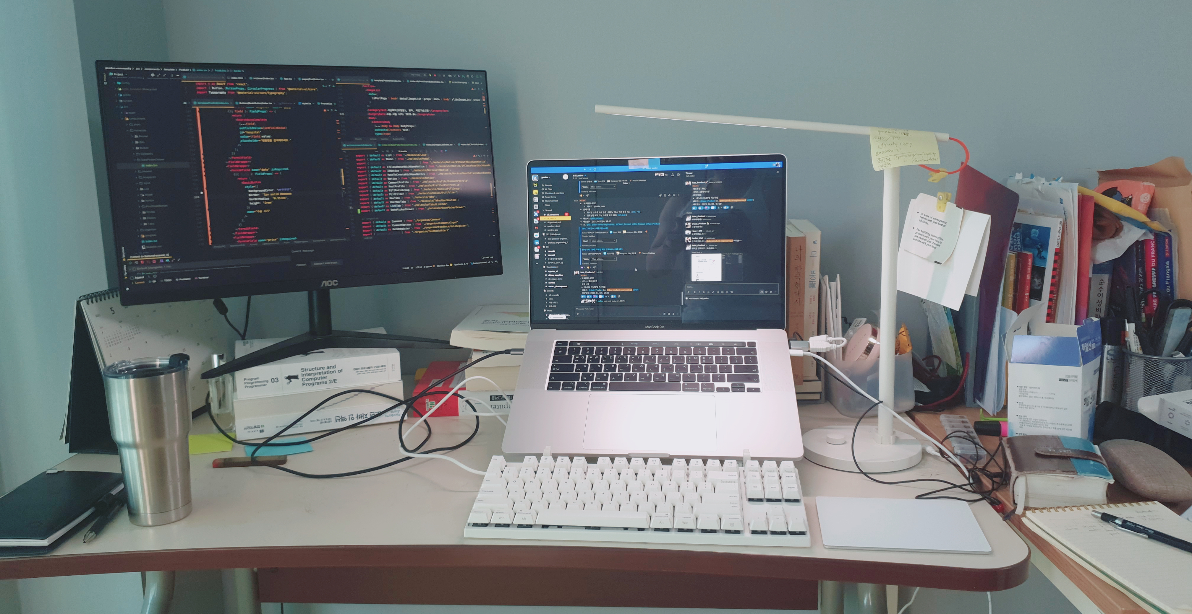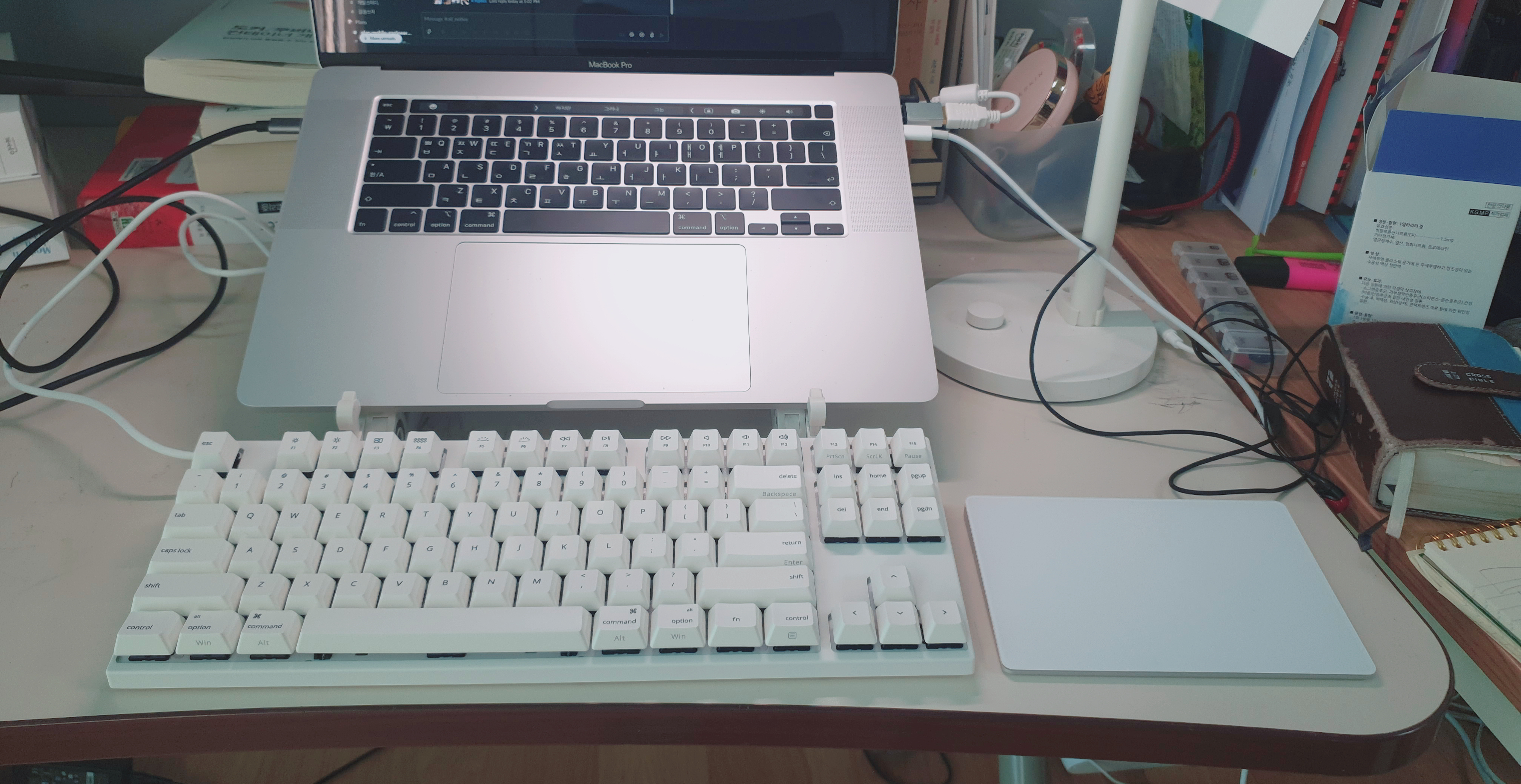 현재 재택근무를 하고 있어서 다른 장비들과 같이 찍은 그림은 다음과 같다.