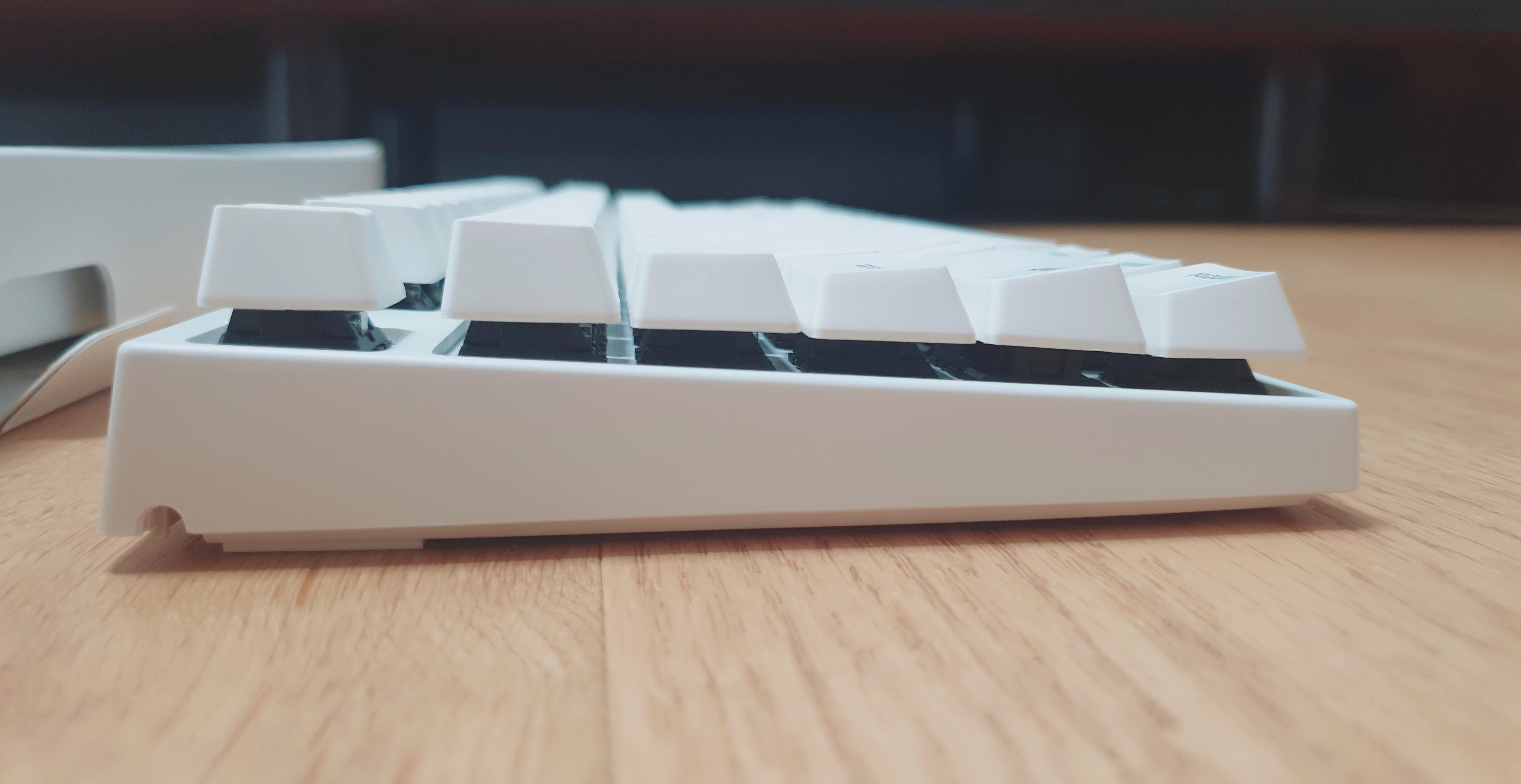 비키 스타일의 키보드여서 키캡 하단 부분이 노출되어 있다. 청소하기는 편하지만 오래 쓰다보면 먼지가 쉽게 쌓일 수도 있을 것 같다는 생각이 든다.