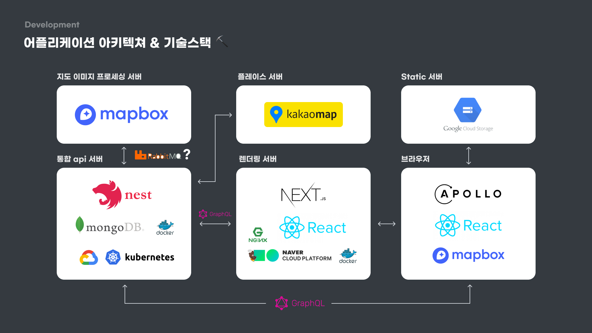 특이한 점은 프론트엔드 서버(Next)와 백엔드 서버(Nest)를 두 개 두었으며 브라우저에서도 백엔드 서버를 찌르고, 프론트엔드 서버에서도 백엔드 서버를 GQL로 찌른다는 점이다. Static 서버의 경우는 이미지 등의 저장소로 사용하였다.