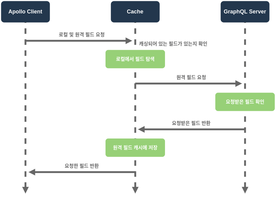 상태관리는 Apollo Client를 선택했다. Apollo Client는 ContextAPI, Redux, MobX 등과 같이 React에서 전역으로 상태를 관리할 수 있는 도구이다. GraphQL(GQL)을 사용하여 서버와 통신하기 때문에, Apollo Client를 사용하면 반환 값을 캐시로 보관할 수 있고, 다른 라이브러리 없이 이것만 가지고 로컬 상태를 함께 관리할 수 있다. Apollo Client 에서 GQL 서버와 통신하는 로직은 아래 그림을 통해 이해할 수 있다.