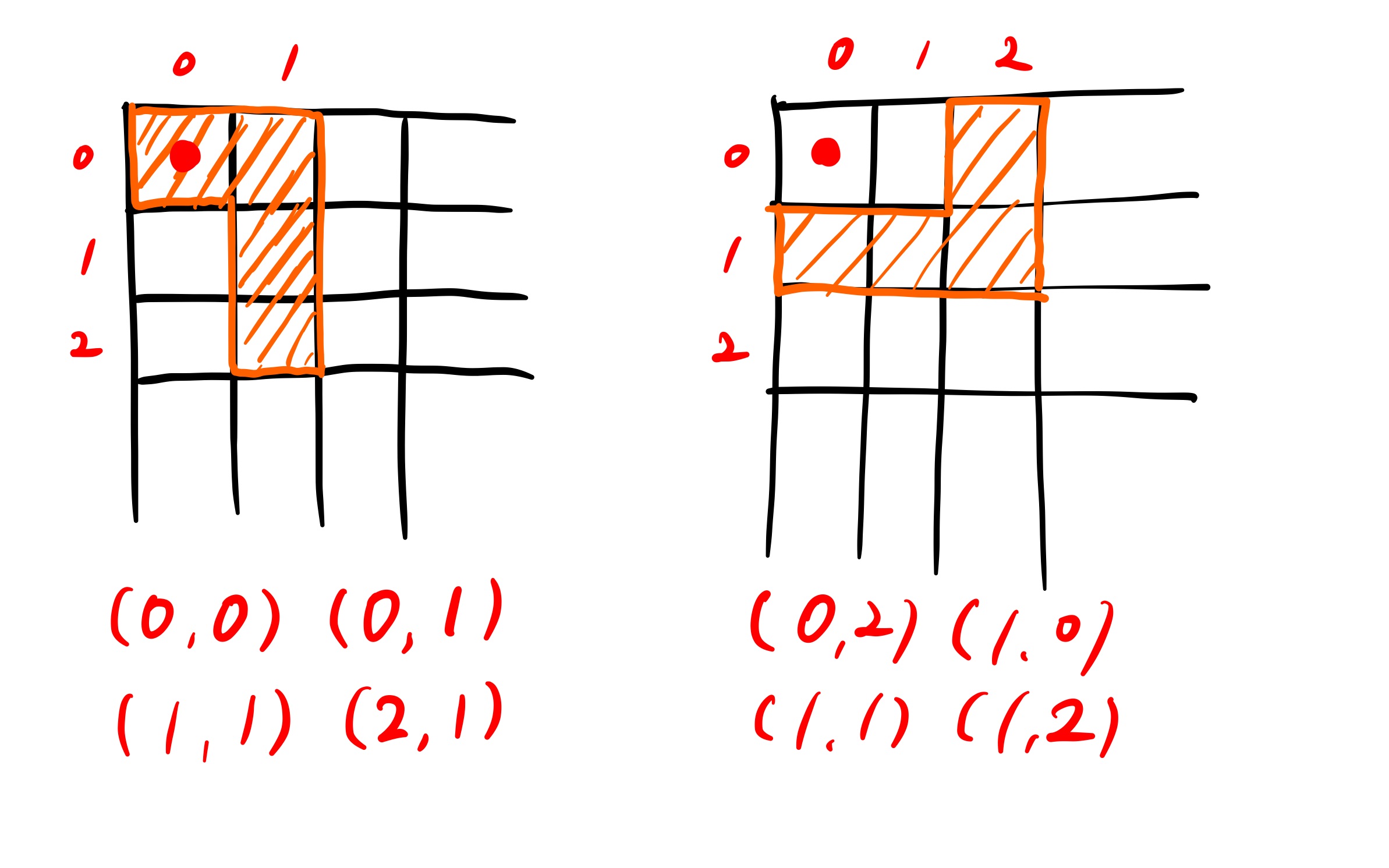 이 빨간색 점을 기준 점으로 두었다. 왼쪽의 경우 이 빨간 점이 (0, 0) 부터 (M-1, N-1)까지 돌면 그 동안 주황색 테트로미노가 지나가는 점수는 빨간 점에서 아래의 격자 포인트 만큼 계산해서 더해줄 수 있다. 예를 들어 빨간 점이 (2, 4) 이면 (2, 4), (2, 5), (3, 5), (4, 5) 이렇게 네 개의 숫자를 더해주면 되는 것이다. 기준점이 꼭 테트로미노 안에 있을 필요는 없다. 오른쪽 테트로미노의 경우는 기준점이 테트로미노 안에 없지만 탐색을 하는데 전혀 문제가 되지 않는다.