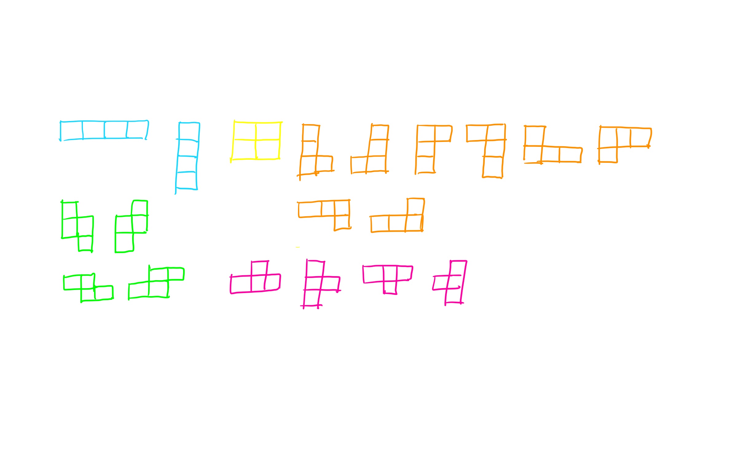 이 문제는 5개의 테트로미노를 뒤집고 돌려서 종이에 놓았을 때 차지하는 4칸의 합을 가능한 경우 모두 구해준 뒤 가장 큰 값을 출력하면 된다. 테트로미노는 5개이지만 실제로 우리가 고려해야 하는 테트로미노는 다음과 같이 총 19개가 된다.