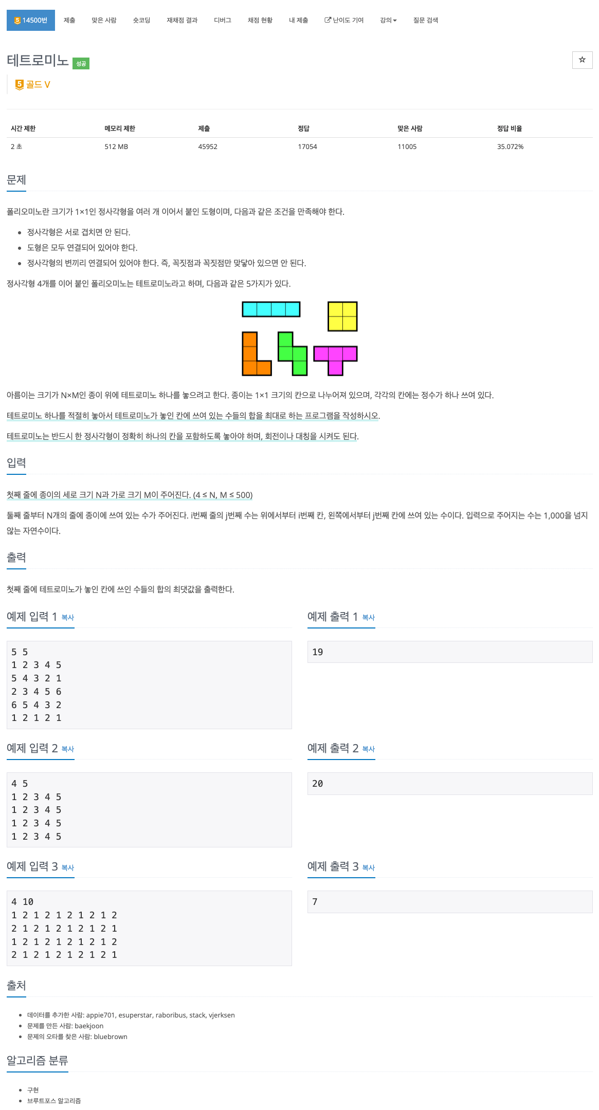 이 문제는 5개의 테트로미노를 뒤집고 돌려서 종이에 놓았을 때 차지하는 4칸의 합을 가능한 경우 모두 구해준 뒤 가장 큰 값을 출력하면 된다. 테트로미노는 5개이지만 실제로 우리가 고려해야 하는 테트로미노는 다음과 같이 총 19개가 된다.