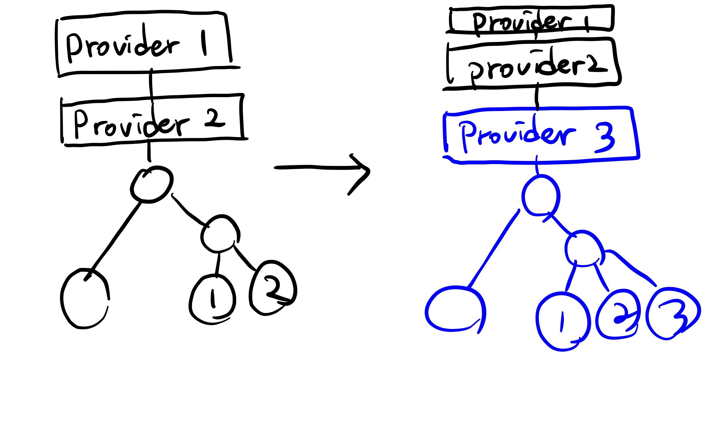 Provider 하위의 모든 consumer들은 Provider의 속성이 변경될 때 마다 다시 렌더링이 일어난다. Provider에서 복잡한 값을 들고 있다면 그 context를 구독하고 있는 모든 하위의 컴포넌트들이 다시 리렌더링이 일어나게 될 것이다. 아래의 그림에서 왼쪽 상태에서 Provider 3을 감싸주면 오른쪽에 파란색으로 칠한 하위 컴포넌트가 모두 리렌더링이 발생하고 이는 복잡도가 증가할수록 비효율적으로 이루어진다. 성능도 안 좋고, Provider와 컴포넌트 트리 사이에 커플링이 생긴다.