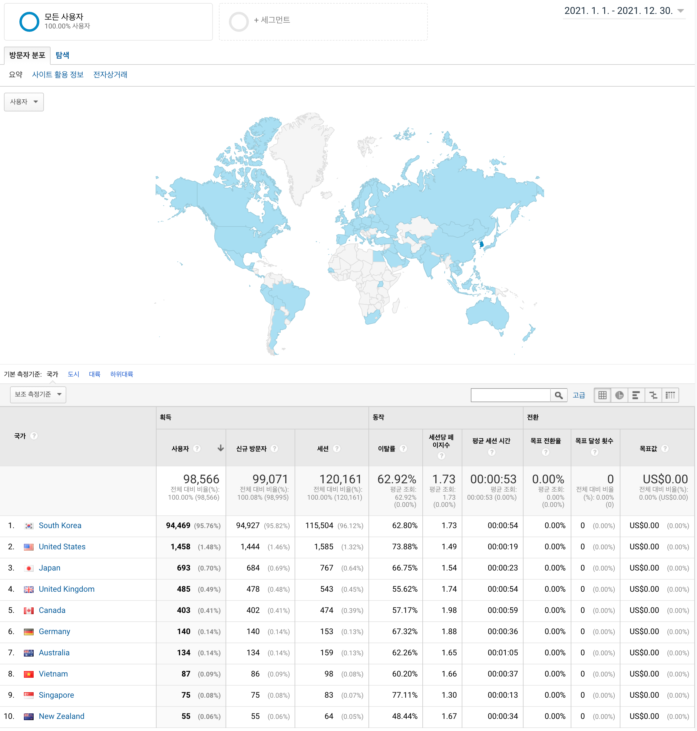 국가별로 방문자수 통계를 내보면 너무나도 당연한 이야기지만 한국(95.8%)이 압도적으로 1위이고, 그 뒤를 미국(1.5%)이 잇고 있다. 3위는 일본(0.7%), 4위는 영국(0.5%), 5위는 캐나다(0.4%)이다. 6위부터는 0.1%대 이하의 비율이다.